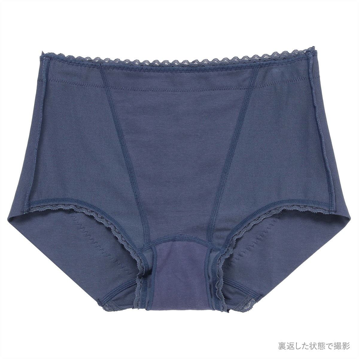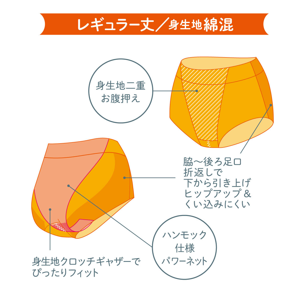 お腹部分の身生地を二重にすることでお腹を効果的に抑えてくれます。お尻の部分はハンモック仕様のパワーネットを使用することでお尻をサポートします。脇から後ろにかけて折り返すことでヒップを下から引上げ、食い込みにくく、ヒップアップ効果があります。