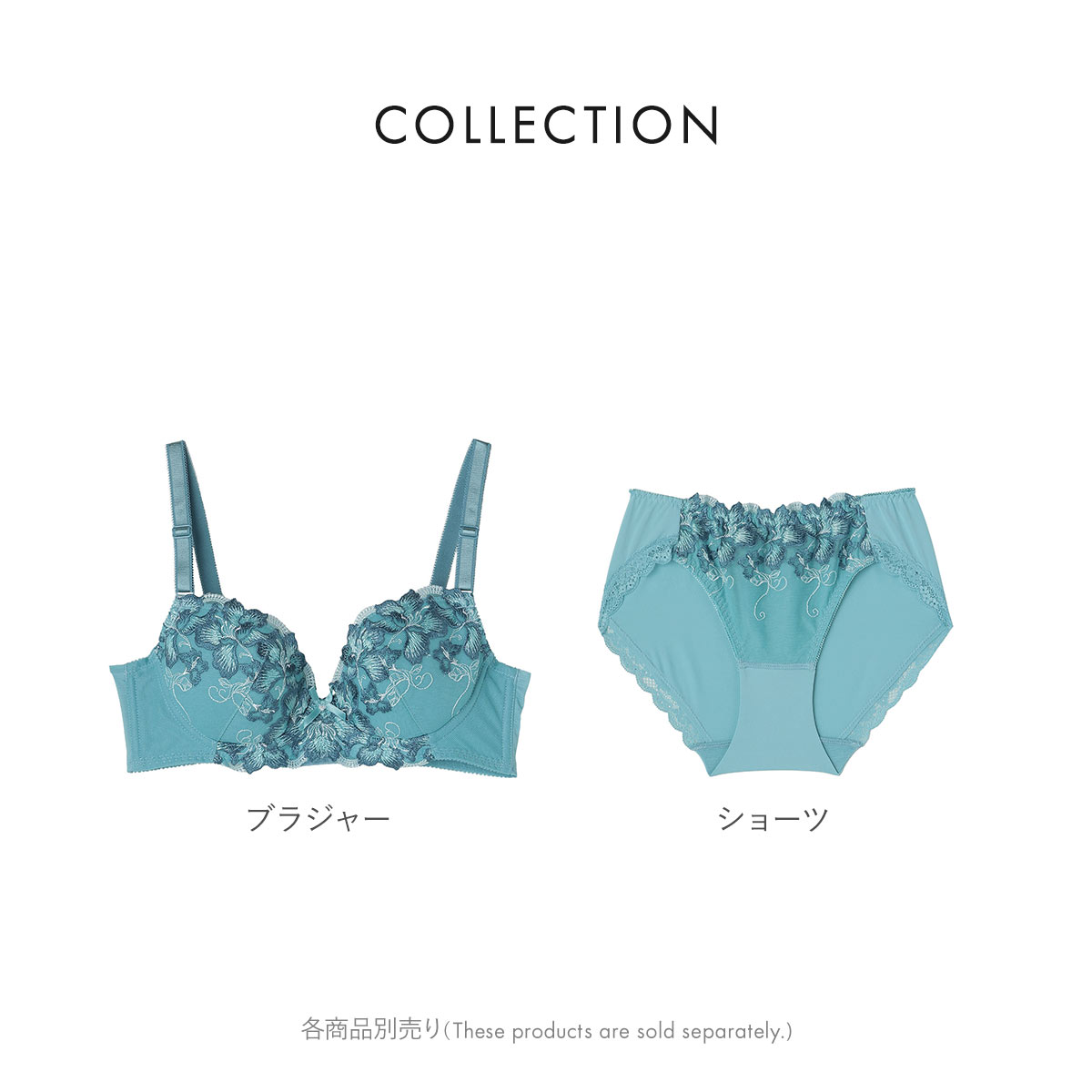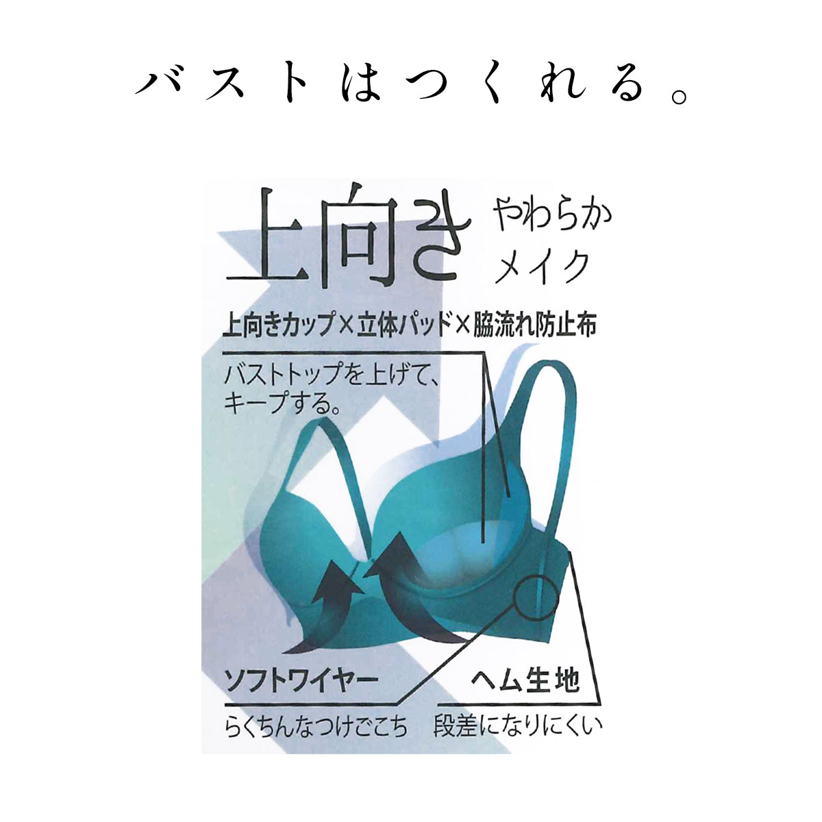 上向きカップ、立体パッド、脇流れ防止布でバストトップを上げてキープします。ヘム生地で段差になりにくく、ソフトワイヤー仕様なのでらくちんな付け心地を実現します。