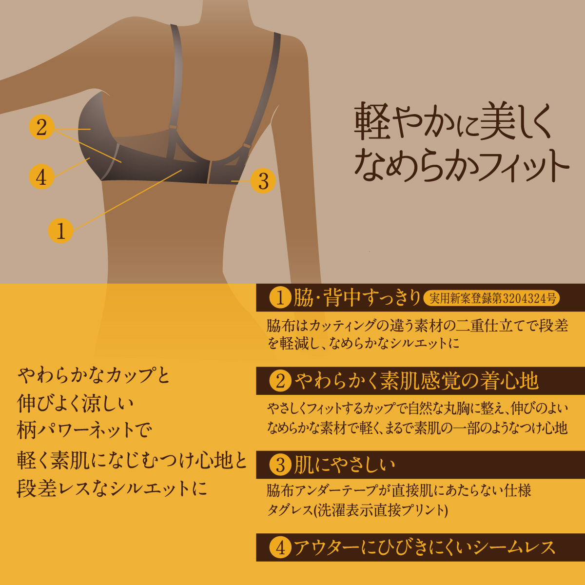 脇布はカッティングの違う素材の二重仕立てで段差を軽減し、なめらかなシルエットに整え、脇・背中すっきり。脇布アンダーテープが直接肌にあたらない仕様でタグレス(洗濯表示直接プリント)のため、お肌にやさしいです。