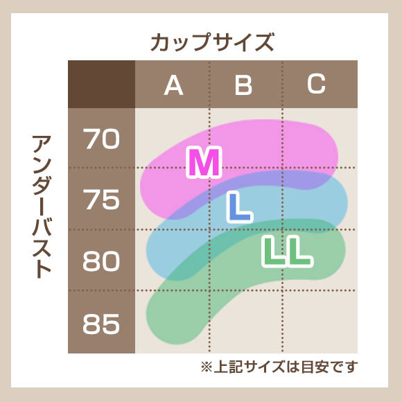 ※カップサイズの目安 M:A70.75、B70.75、C70.75 L:A75.80、B75.80、C75 LL:A80.85、B75.80.85、C75.80 |