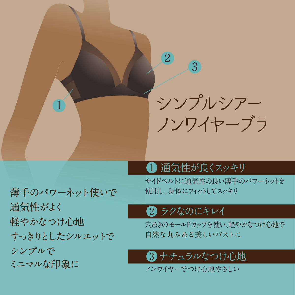 大人の女性のスタイリングをより美しく快適にする、アツギのヌードメイクシリーズ。軽やかエアリーな心地よさのシンプルシアーノンワイヤーブラです。