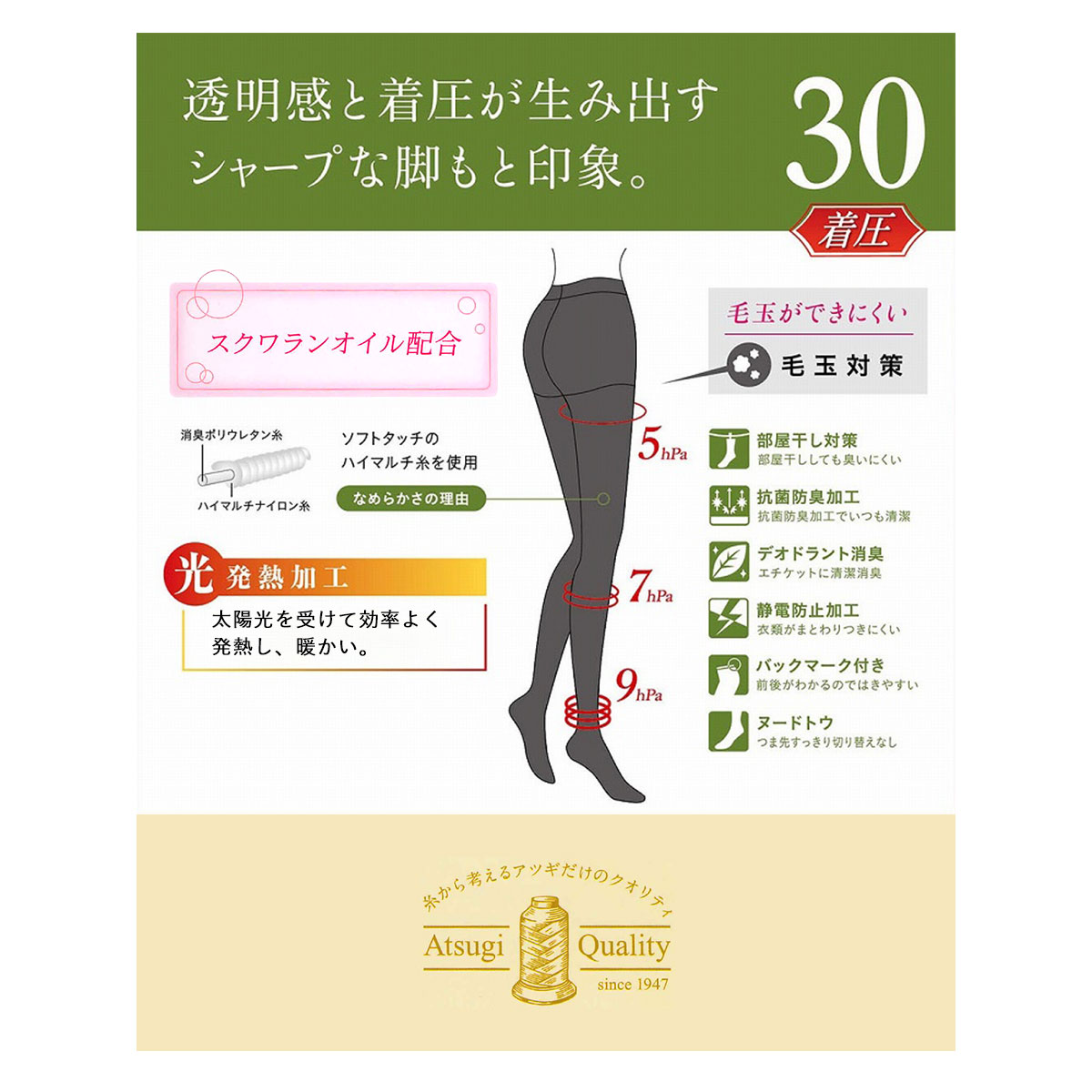糸から考えるアツギだけのクオリティ。透明感と着圧が生み出すシャープな脚もと印象。着圧の薄手タイプ30デニールの2足組です。