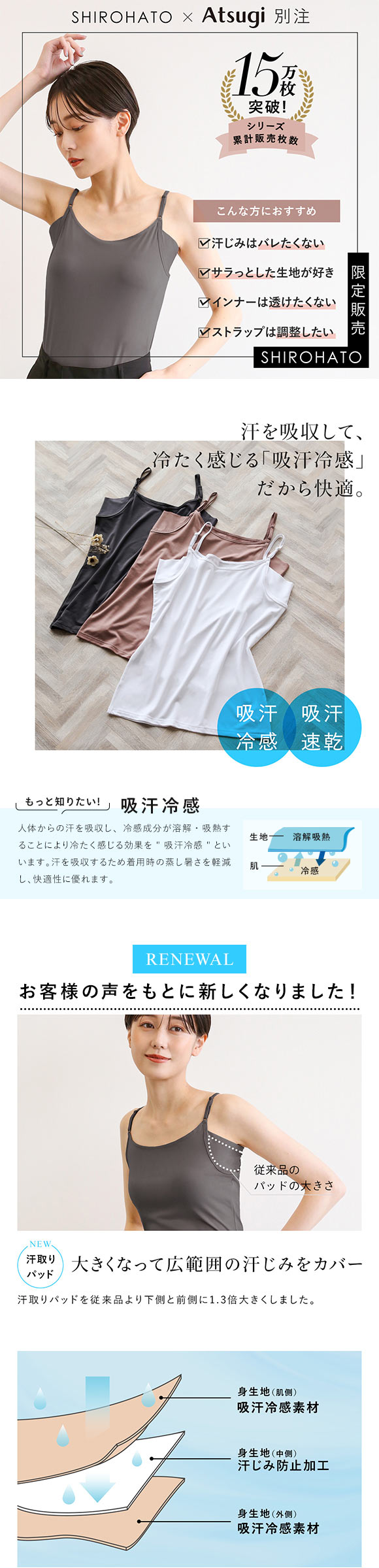 汗を吸収して冷たく感じる「吸汗冷感」機能はそのままに、生地が従来品より少しだけ薄く軽くなって、着用時の蒸し暑さが軽減!お洗濯しても乾きが早いので、毎日のインナーにおすすめです!
