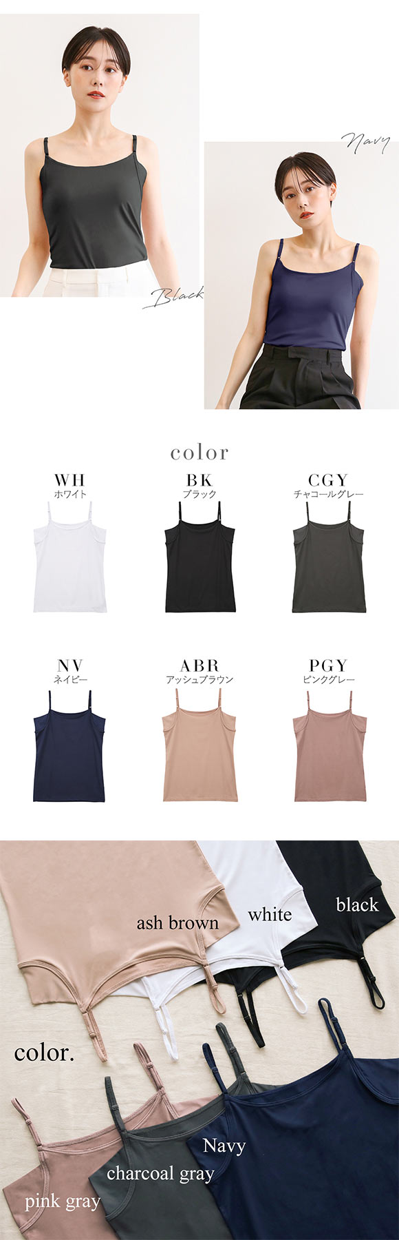| カラー | WH-ホワイト、BK-ブラック、CGY-チャコール、NV-ネイビー、ABR-アッシュブラウン、PGY-ピンクグレー |