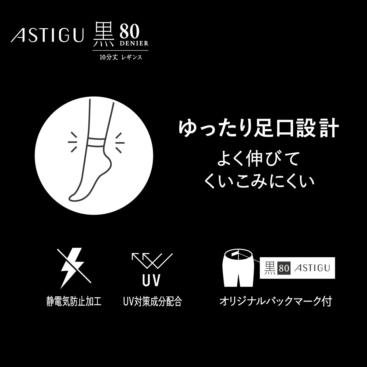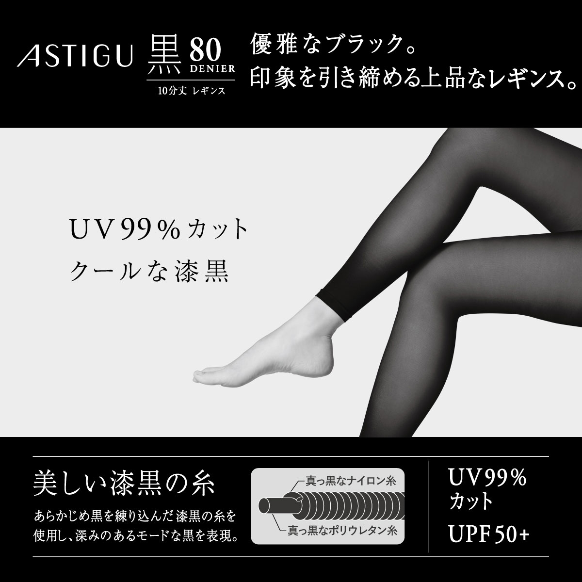 アツギ アスティーグ 黒 クールな漆黒 80デニール10分丈レギンス UVカット ATSUGI ASTIGU