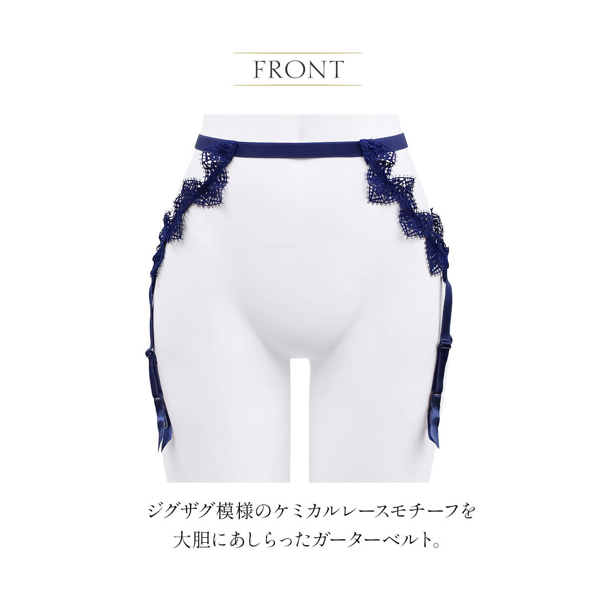 コレクションテーマでもあるジグザグ模様のケミカルレースモチーフを大胆にあしらったガーターベルト。いつものスタイルをラグジュアリーに格上げしてくれるアイテムです。同コレクションのランジェリーと合わせるとより魅力的に。