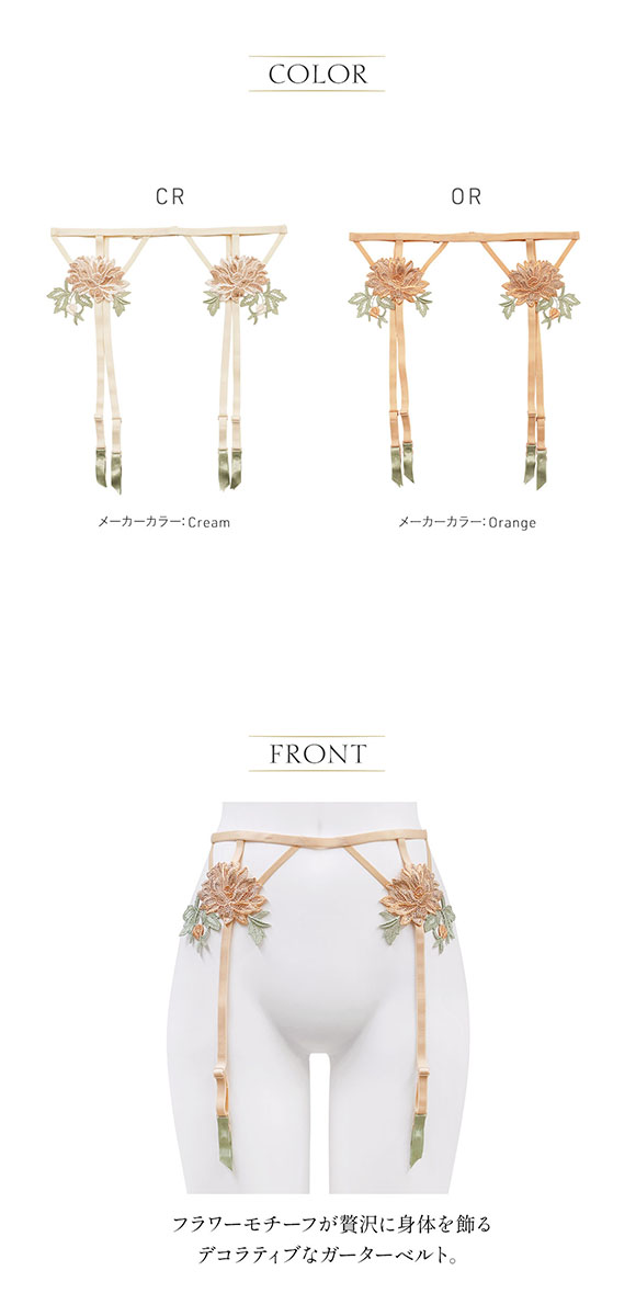 フラワーモチーフが贅沢に身体を飾るデコラティブなガーターベルト。ランジェリースタイルの完成度をぐっと高めるラグジュアリーなアイテムです。ガーターベルトは身体のラインにメリハリを与えてくれる視覚効果もあります。同コレクションHeartのランジェリーと合わせるとより魅力的に。