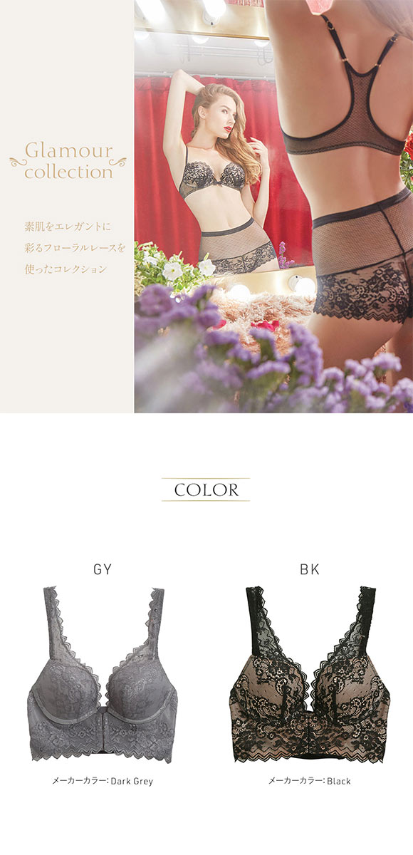 素肌をエレガントに彩るフローラルレースを使ったGlamourコレクション。センシュアルなムードを演出するグレーとブラックの2色展開。
