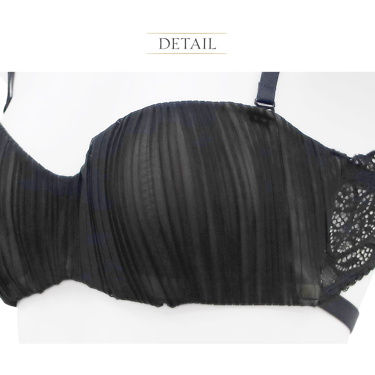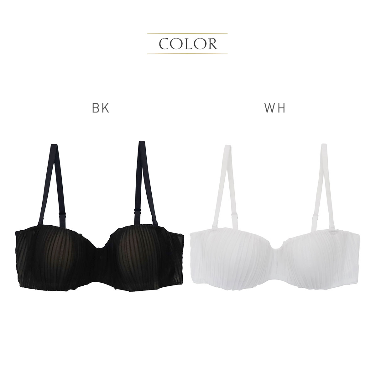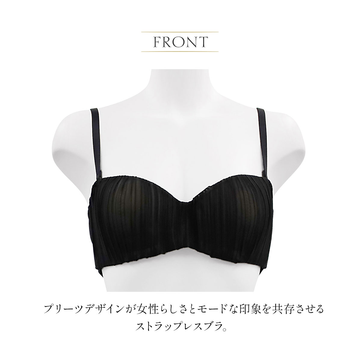 プリーツデザインが女性らしさとモードな印象を共存させるストラップレスブラです。自在に調整できるアジャスターと着脱可能なストラップで、アウターに合わせてアレンジが可能。見せブラとしてもご使用いただけます。