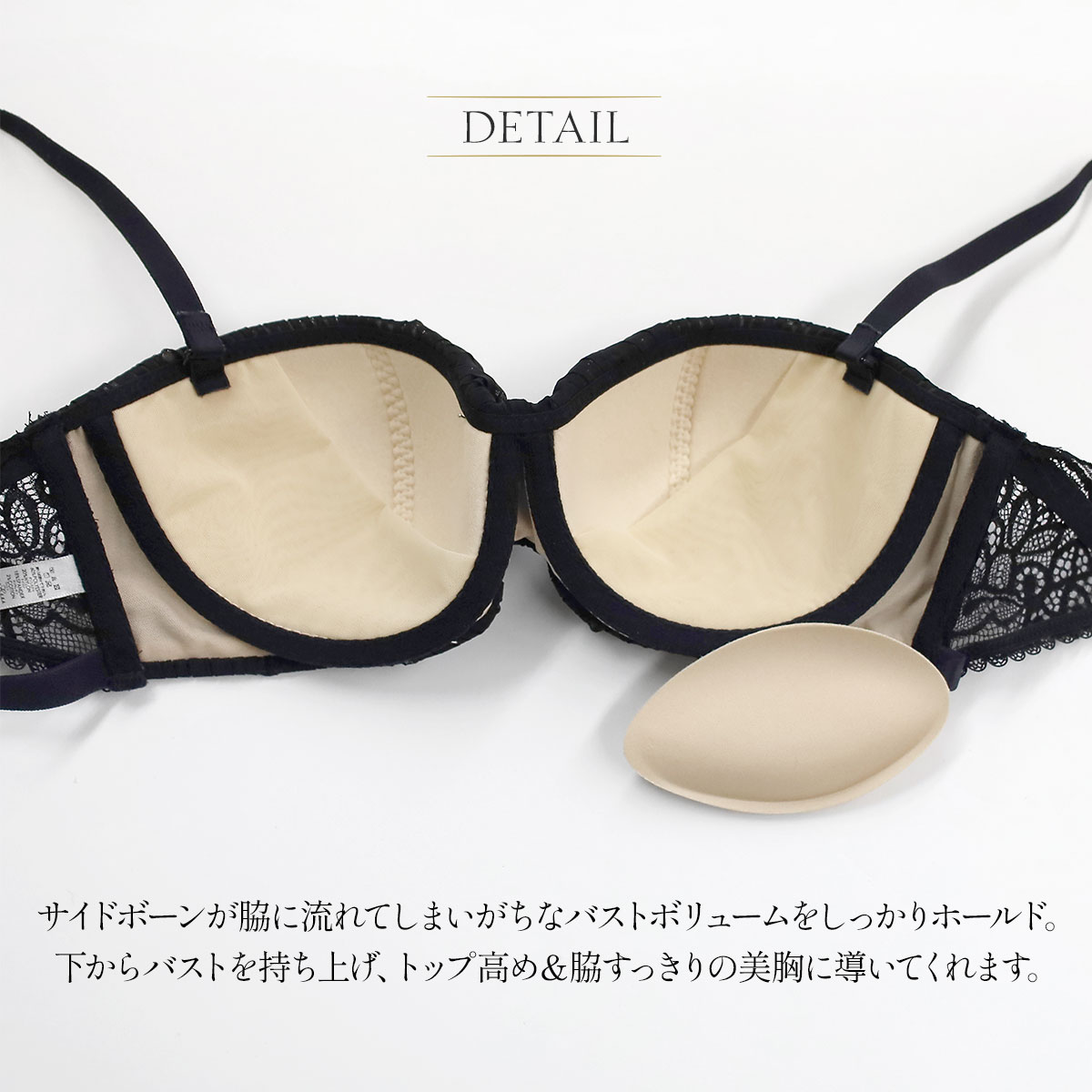 サイドボーンが脇に流れてしまいがちなバストボリュームを逃がさずしっかりホールドし、下からバストを持ち上げ、トップ高め&脇すっきりの美胸に導いてくれます。同コレクションでのコーディネートがおすすめです。