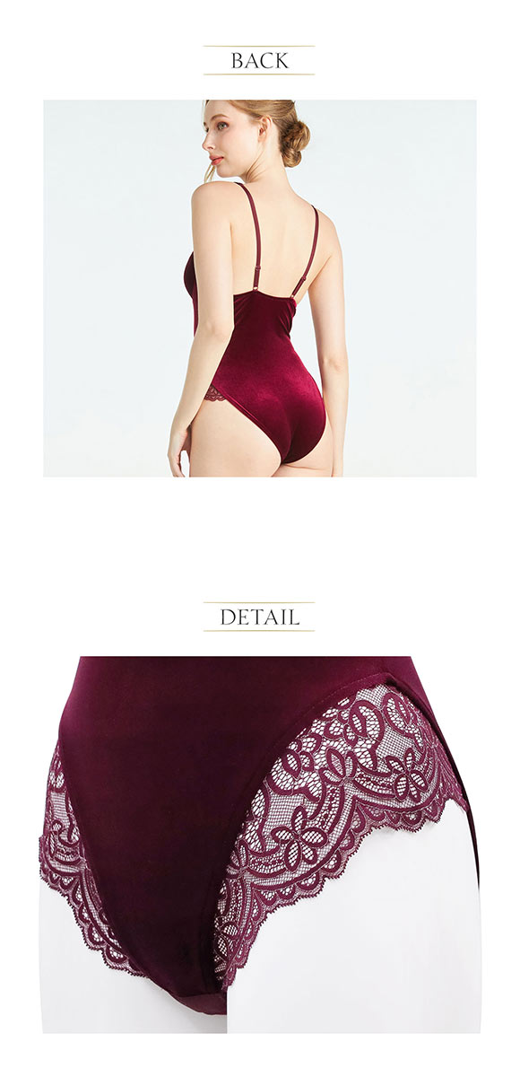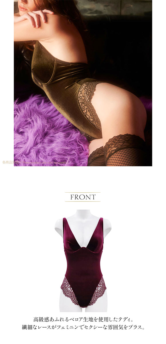 高級感あふれるベロア生地を使用したテディ。繊細なレースがフェミニンでセクシーな雰囲気をプラス。U字ワイヤーがしっかりとバストを支え、美しいシルエットを演出。