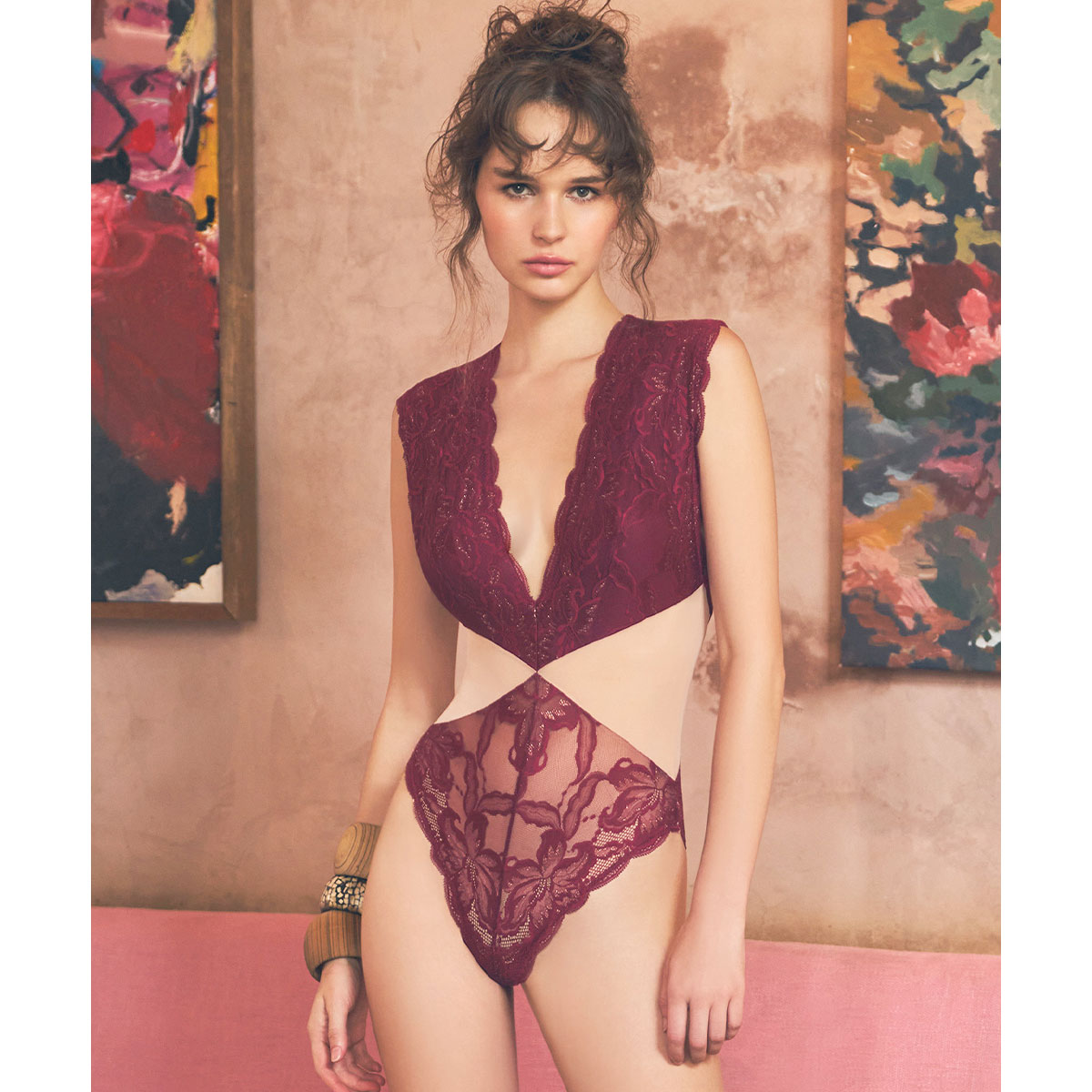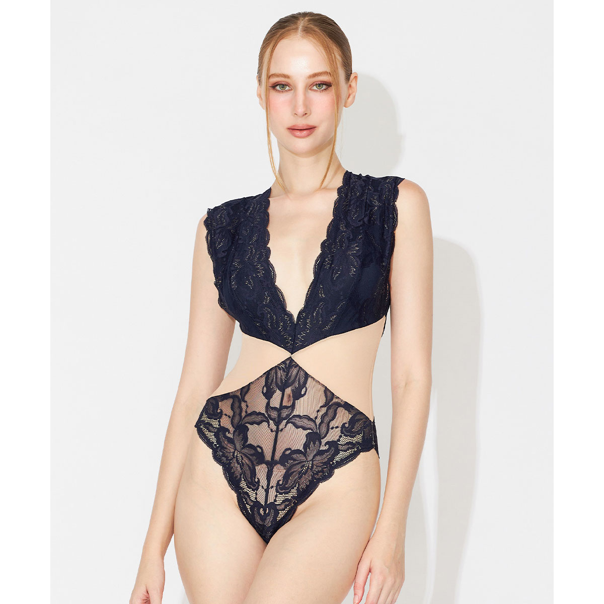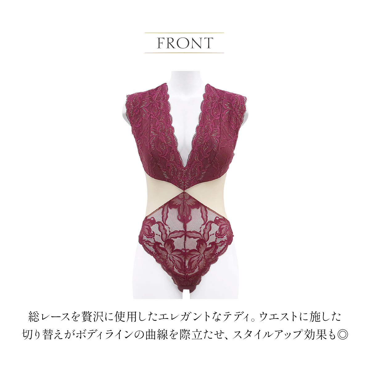 総レースを贅沢に使用したエレガントなテディ。ウエストに施した切り替えがボディラインの曲線を際立たせ、スタイルアップ効果も◎素肌になじむソフトで繊細なレースが、甘さの中にセンシュアルな魅力を引き出します。