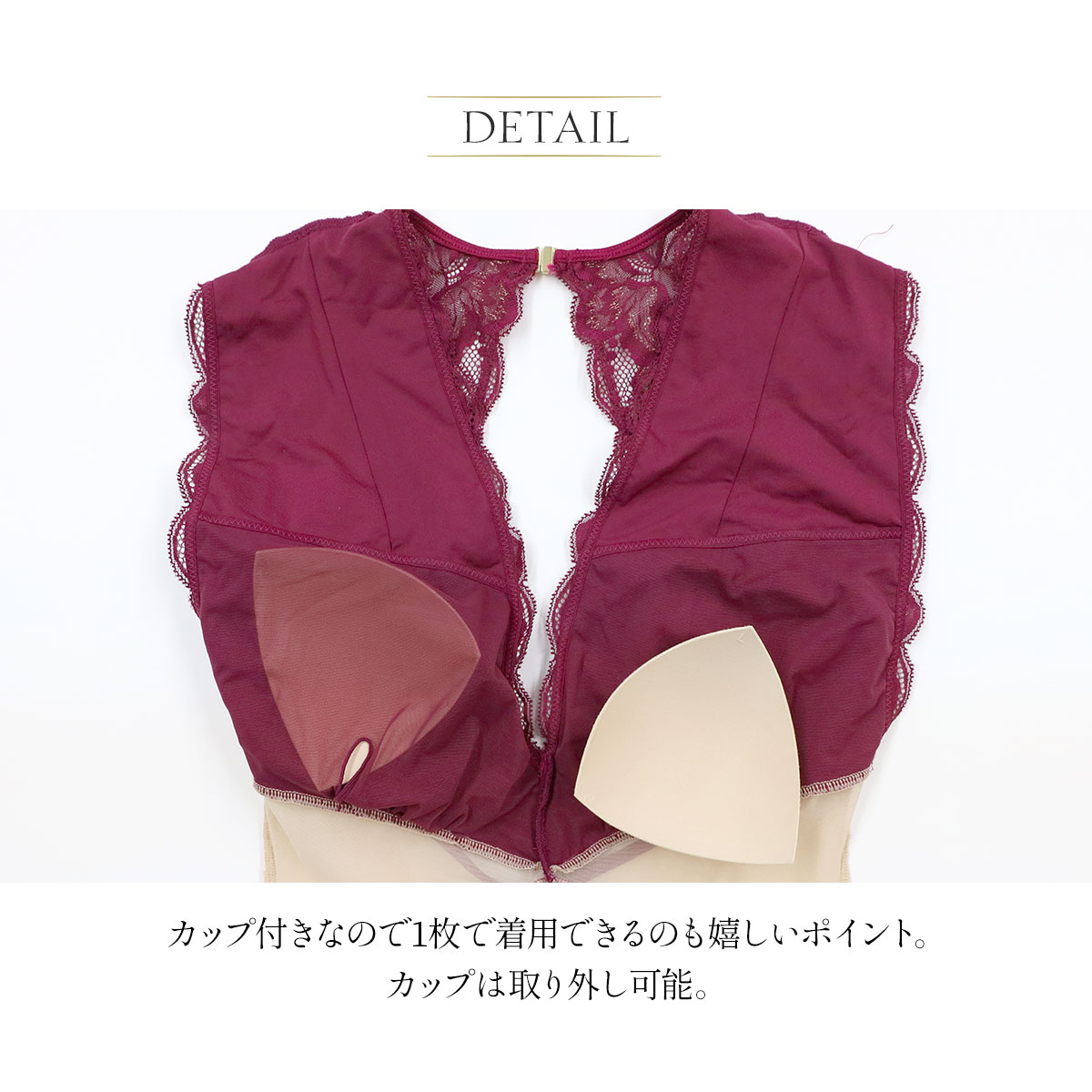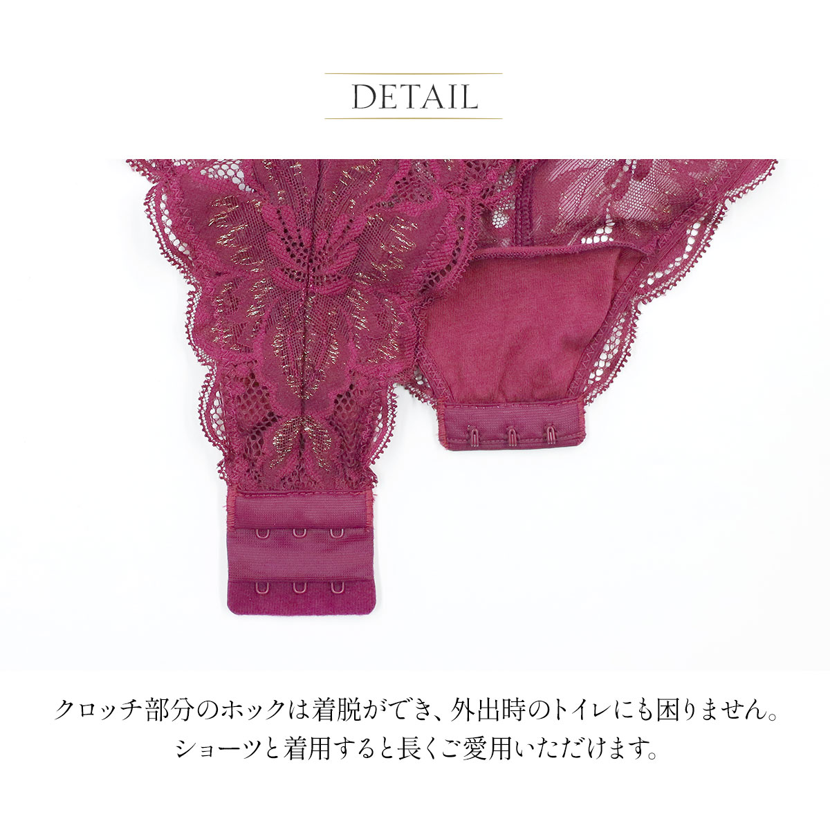 カップ付きなので1枚で着用が可能。クロッチ部分のホックは着脱ができ、外出時のトイレにも困りません。ショーツと着用すると長くご愛用いただけます。
