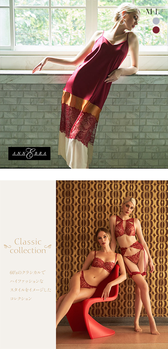 60'sのクラシカルでハイファッションなスタイルをイメージしたコレクションClassic。ゴールドのラメ糸が煌めく細やかなフラワーレースが、エレガントなスタイルにリュクスなエッセンスをプラスします。トーンを抑えた上品なBlueと、大人の色香を引き出すDark Redの2色展開。