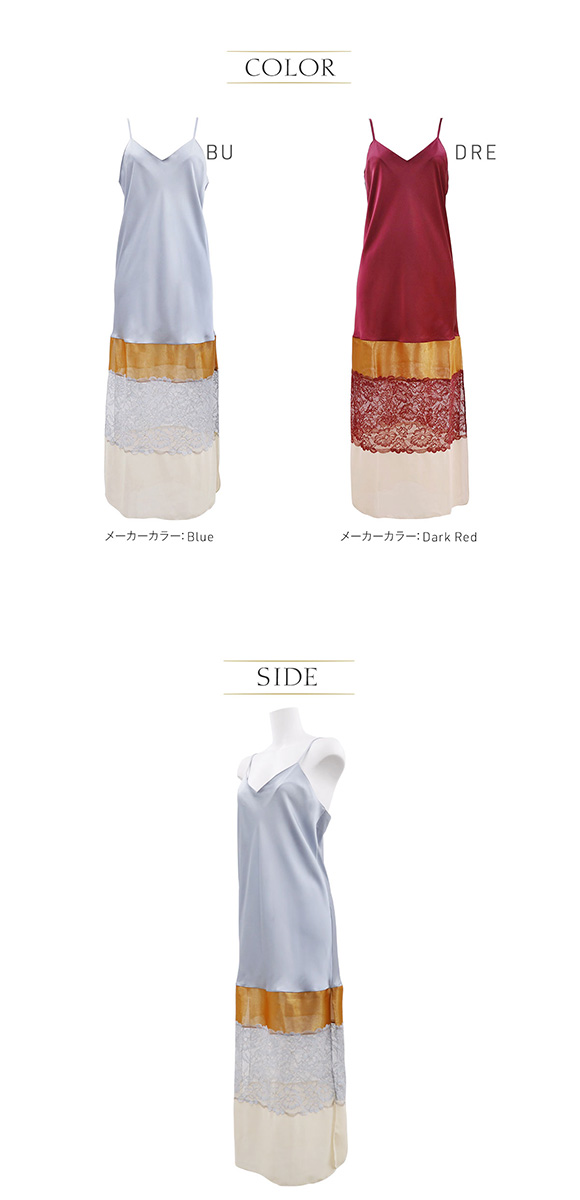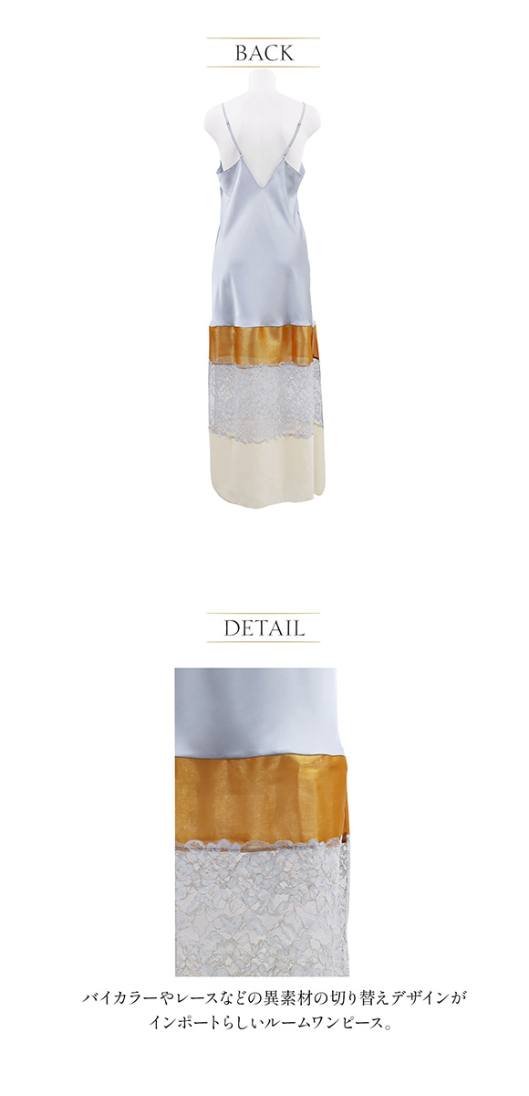 バイカラーやレースなどの異素材の切り替えデザインがインポートらしいルームワンピース。サイドはスリット入りなので脚にまとわりつかず動きやすいです。