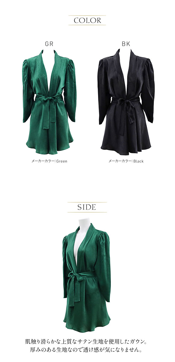 肌触り滑らかな上質なマットサテン生地を使用したガウン。厚みのある生地なので透け感が気になりません。袖は丸みのあるパワショルでシルエットにメリハリを持たせ、モードな印象に。ランジェリースタイルの仕上げにはもちろん、さっと羽織るだけでも上品に決まります。