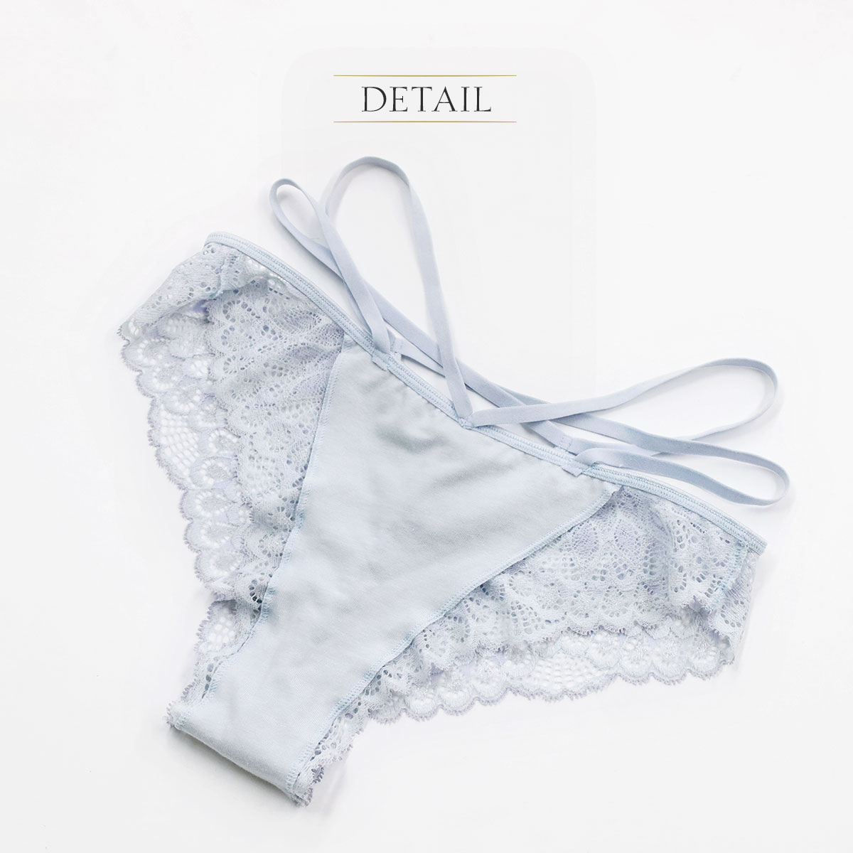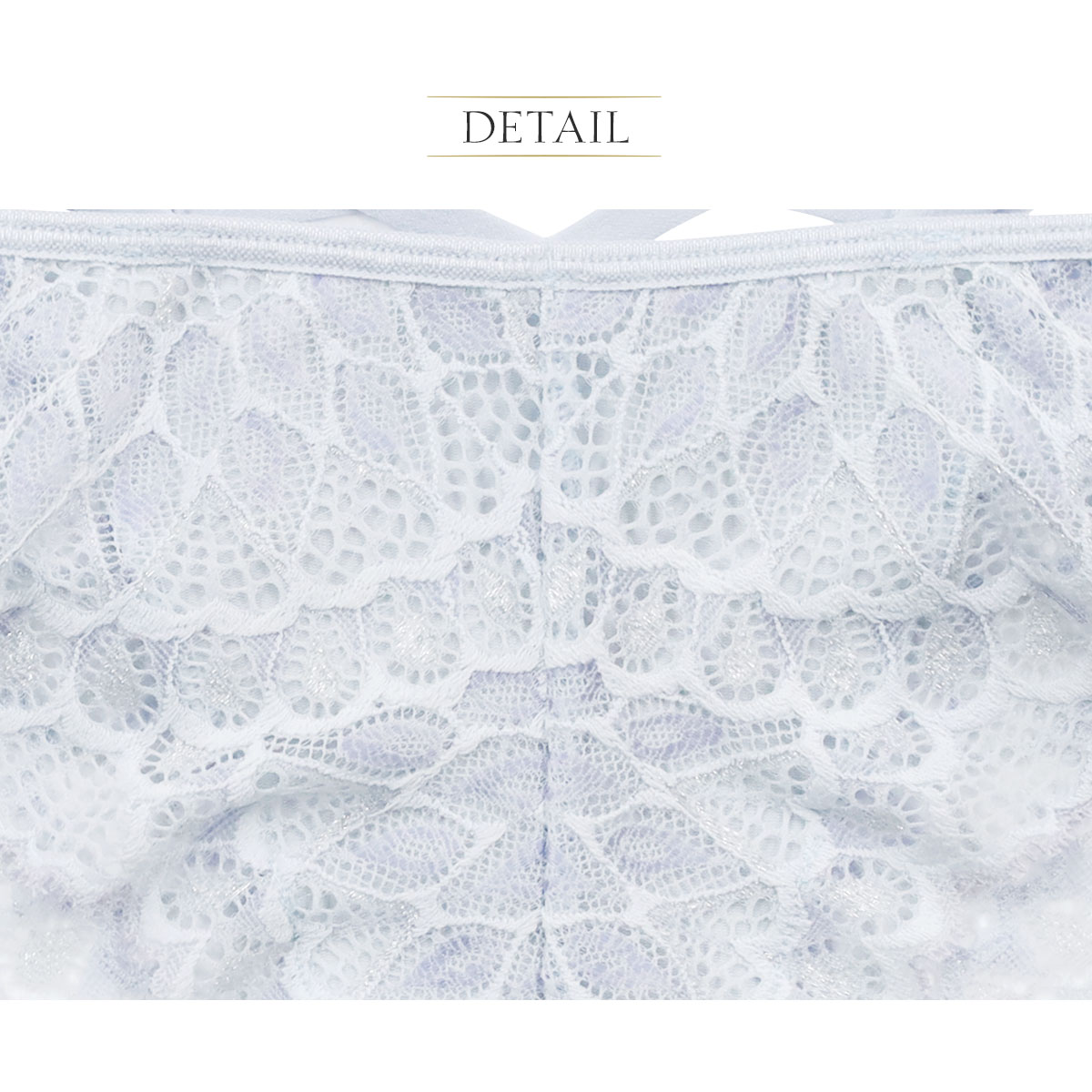 優美な雰囲気のレースを使用したショーツ。柔らかく繊細なレースが肌に優しくフィットします。個性的なストリングデザインがアクセントに。バックはレース一枚で蒸れにくく、快適な履き心地。フロントにはレースと同色の肌触り柔らかな生地を裏打ちしています。