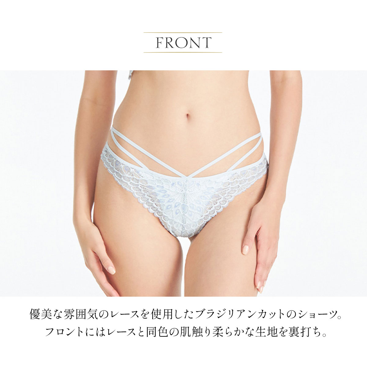 優美な雰囲気のレースを使用したブラジリアンカットのショーツ。柔らかく繊細なレースが肌に優しくフィットします。ヒップラインを美しく見せるブラジリアンカットは、足を長く、スタイル良く見せる効果があります。