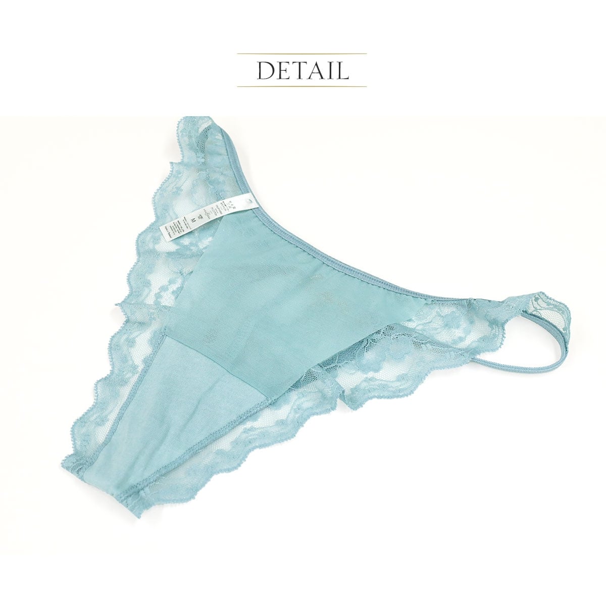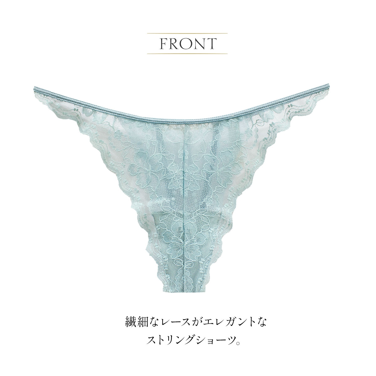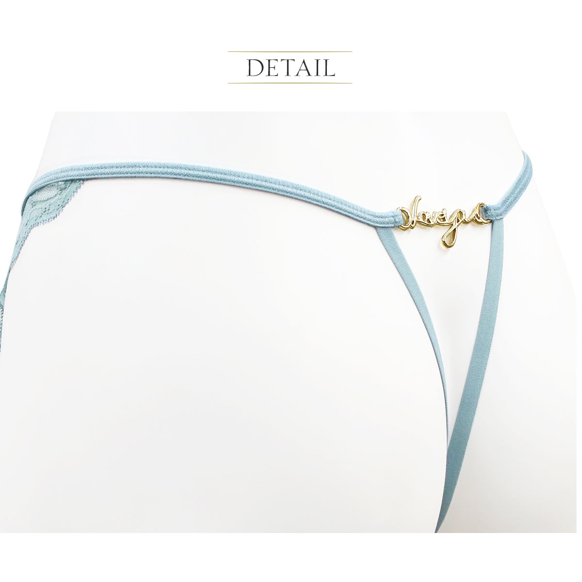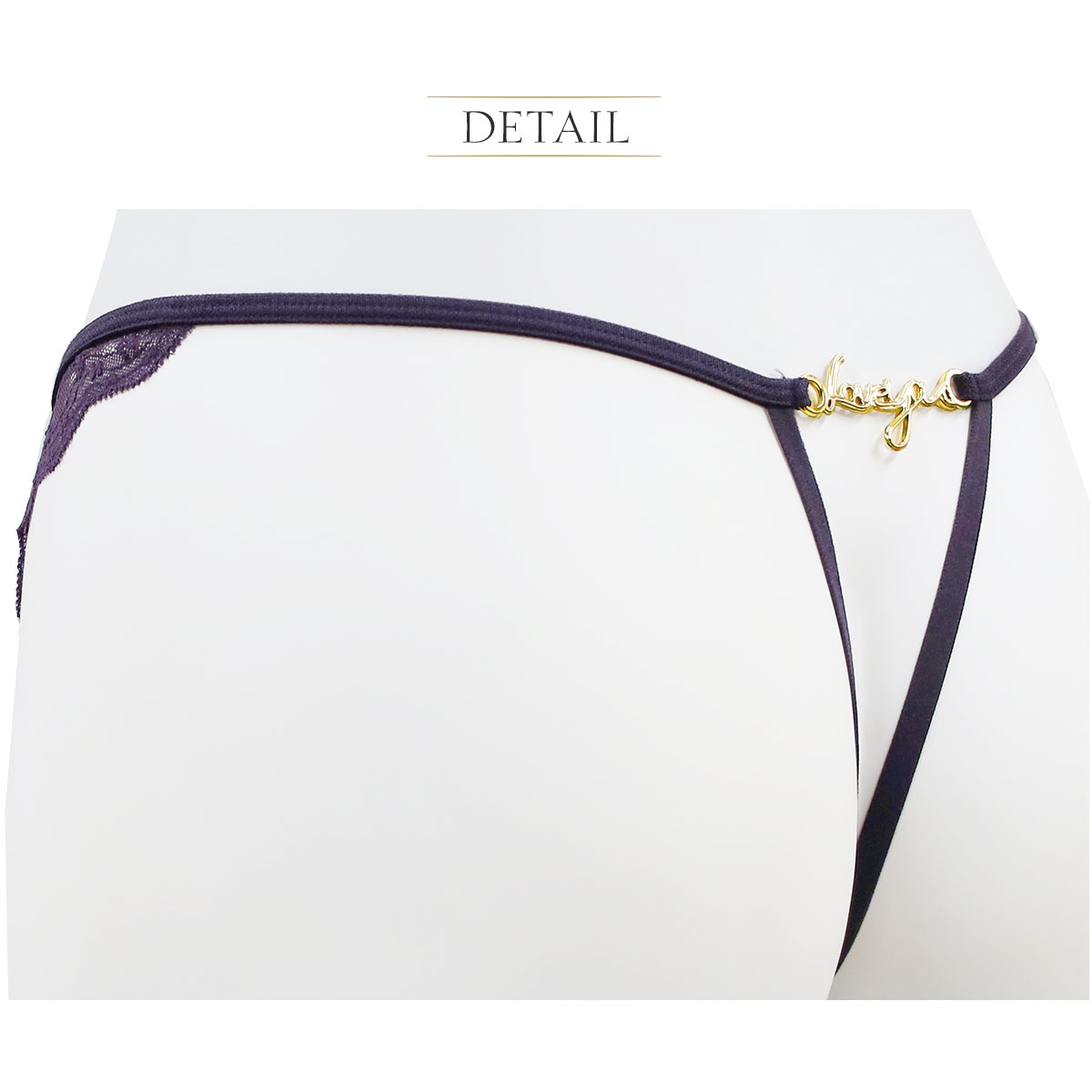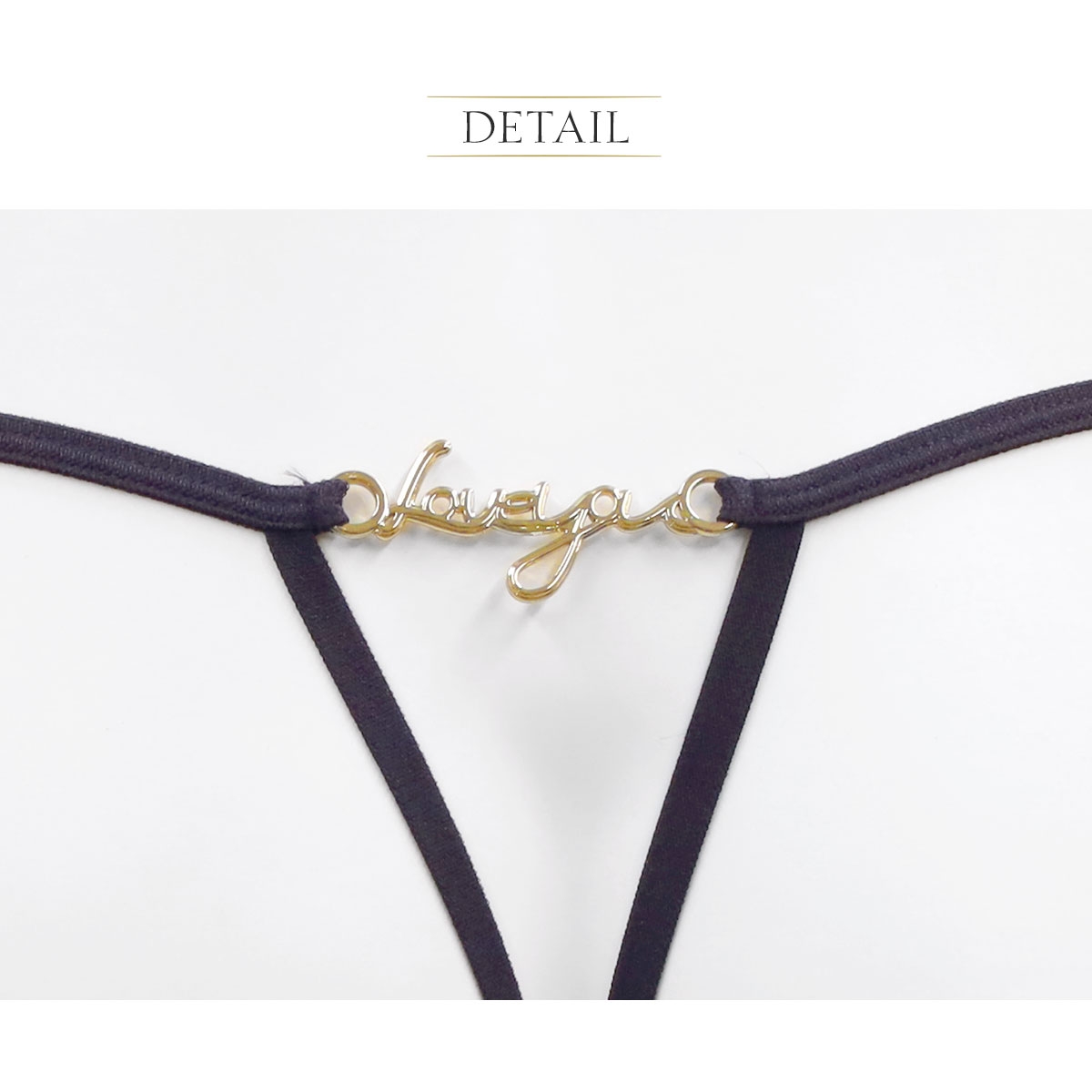 繊細なレースがエレガントなストリングショーツ。バックの「Love You」のゴールドチャームが光を受けてきらめき、センシュアルでロマンチックな雰囲気を演出します。大胆なV字のストリングが刺激的なデザイン。