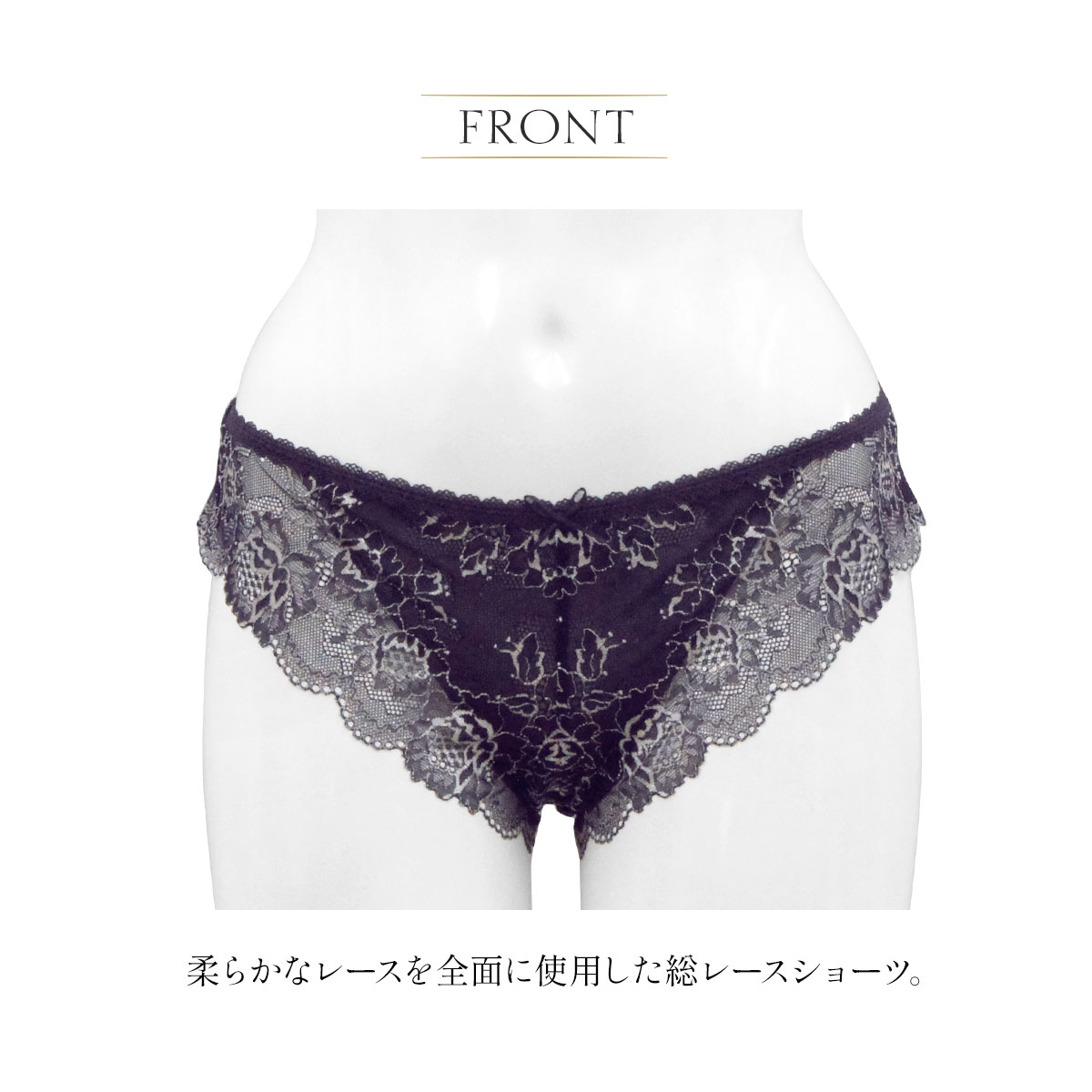 柔らかなレースを全面に使用した総レースショーツ。ハートのくり抜きモチーフがアクセントに。一枚レースなので洋服に響きにくく、パンツスタイルでも気にせずお使いいただけます。