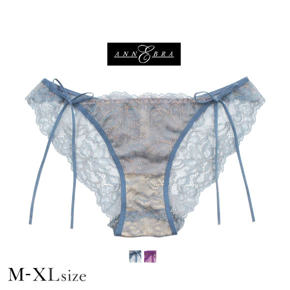 サイドリボンが華奢で可愛らしいショーツ。フロントにはベージュのチュール生地を裏打ち。バックは全面総レースで軽い履き心地です。