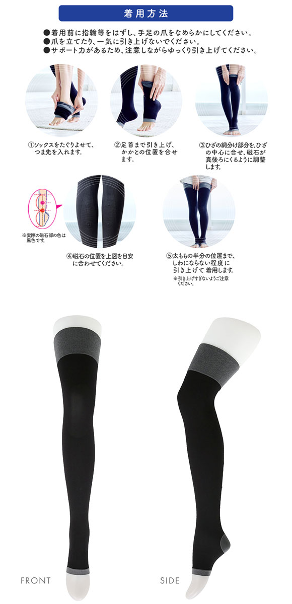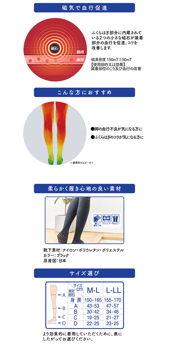 ふくらはぎ部分に内蔵されている2つの小さな磁石が、装着部分の血行を促進・コリを改善します。締め付け過ぎない快適設計で寝ている間も快適ははき心地。太もも部分にはすべり止め加工を施しています。