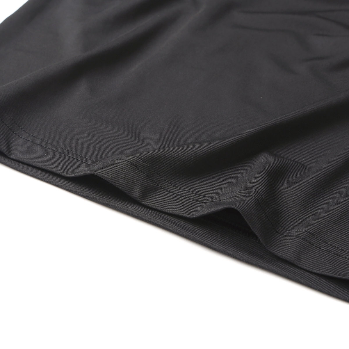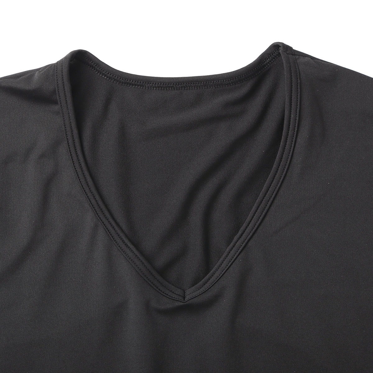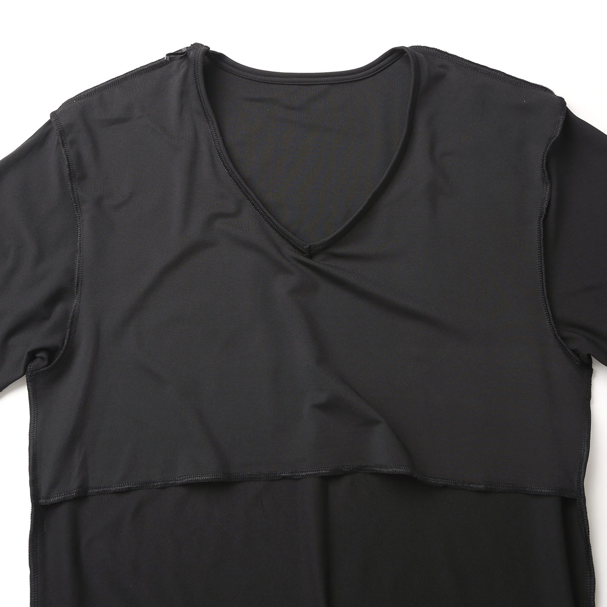 前身頃(胸部分)2重構造にすることで、突起が出にくくする構造に。透け対策にも効果的です。身生地は吸水速乾性があり、汗ばむ時期に心強いポリエステルベア天竺素材を使用。ストレッチ性に富み、快適な着用感です。