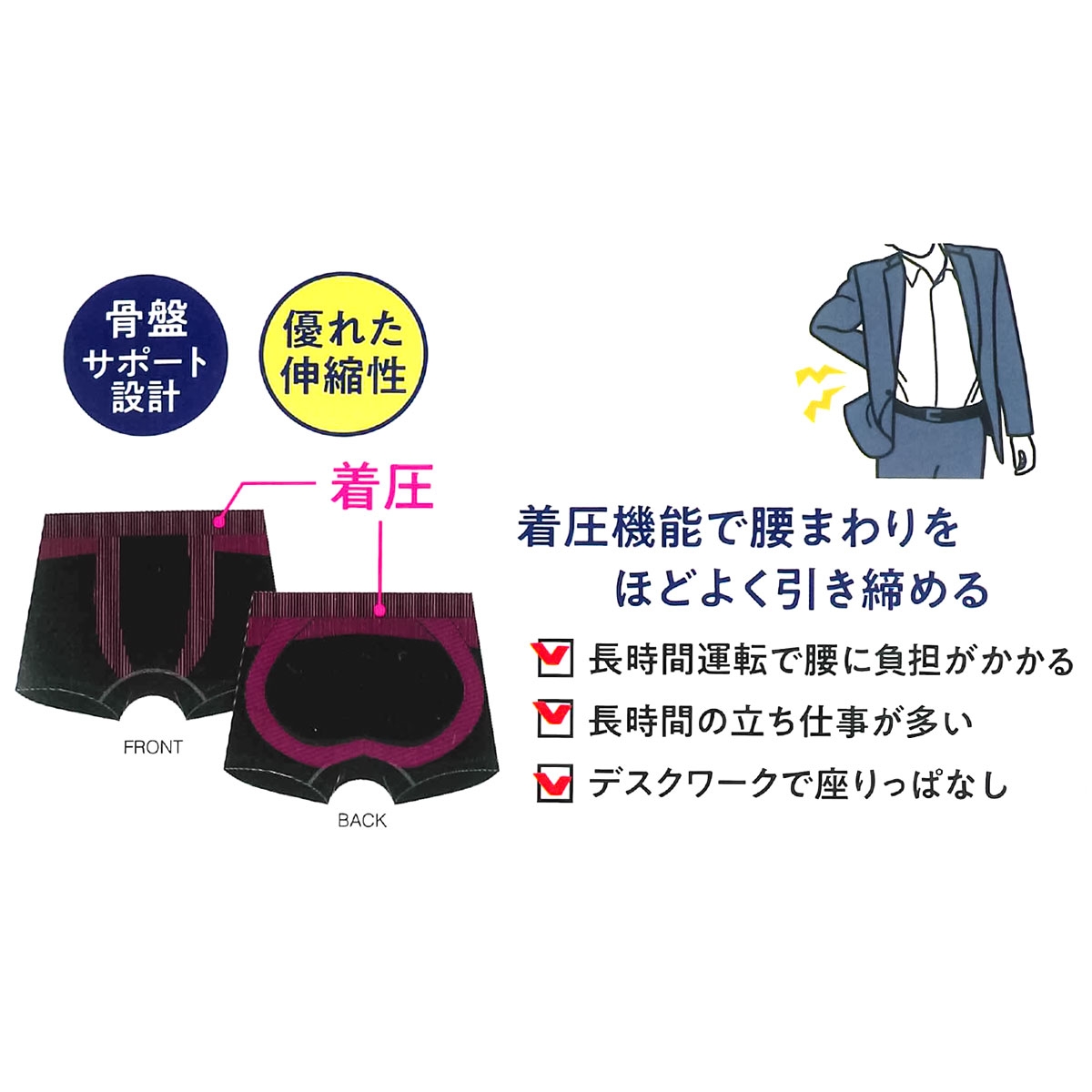 長時間の運転、営業で歩きまわる、立ち仕事が多い、1日中座りっぱなしのデスクワーク、スポーツなど腰に負担がかかるライフワークは数知れず・・・あらゆる生活面で腰はとても重要。そんな腰の負担をサポートするボクサーパンツです。腰回りやヒップラインを着圧設計にし、骨盤周りをほどよい力でサポートします。