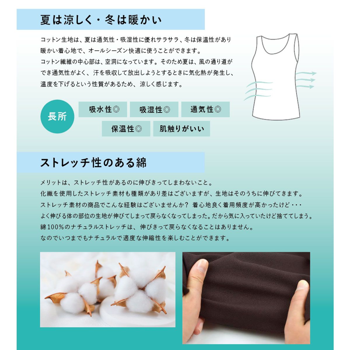 蒸れにくく、素肌に心地よい、さらっとコットン タンクトップです。綿100%の天然素材を使用しながら、ドライ機能があり、いつでもさらっと快適な着心地です。