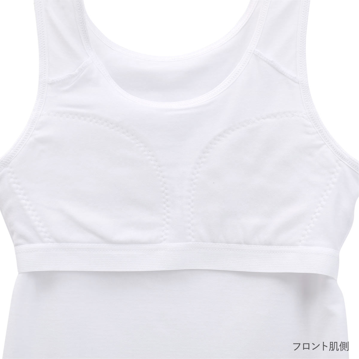 成長中の胸をやさしくガードする、やわらかソフトパッドつき。カップインタイプ(一体型)でズレにくいため、動いても安心です。肌側バストアンダー部分は背中までゴムをぐるりとほどこし、よりフィット感を高めています。