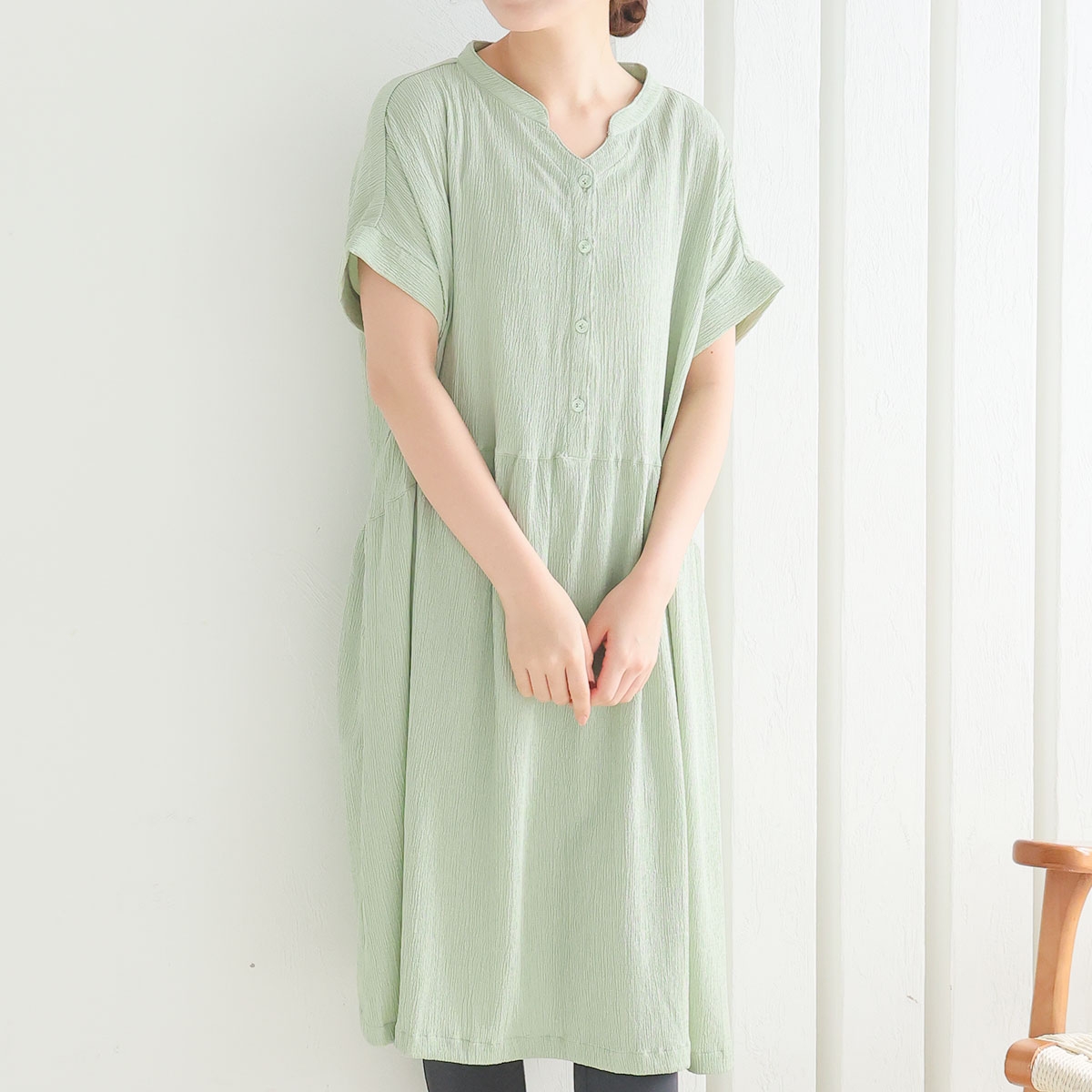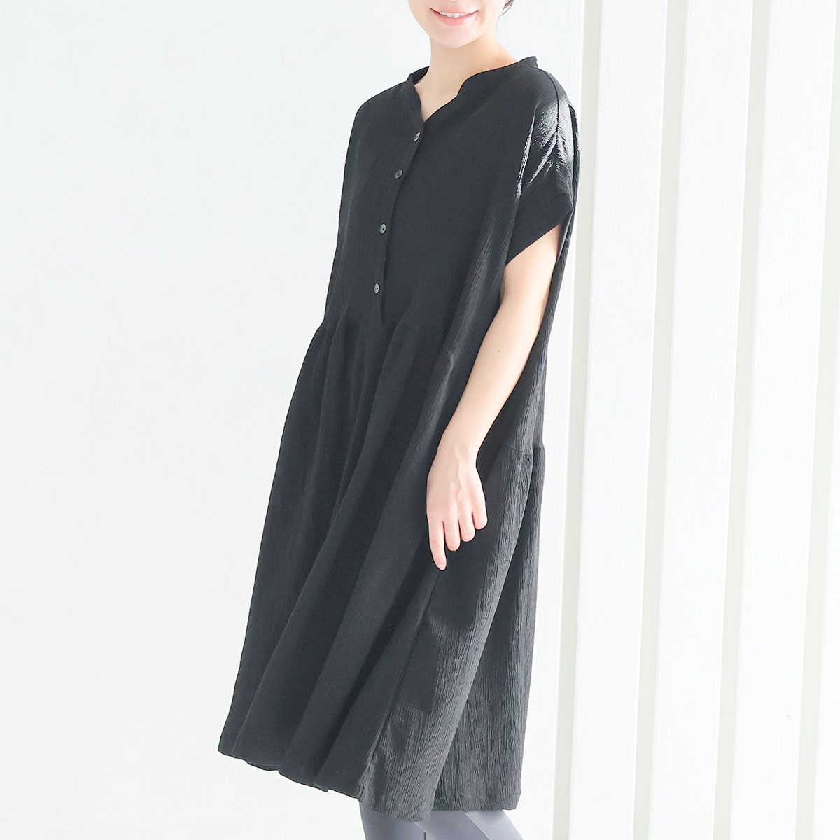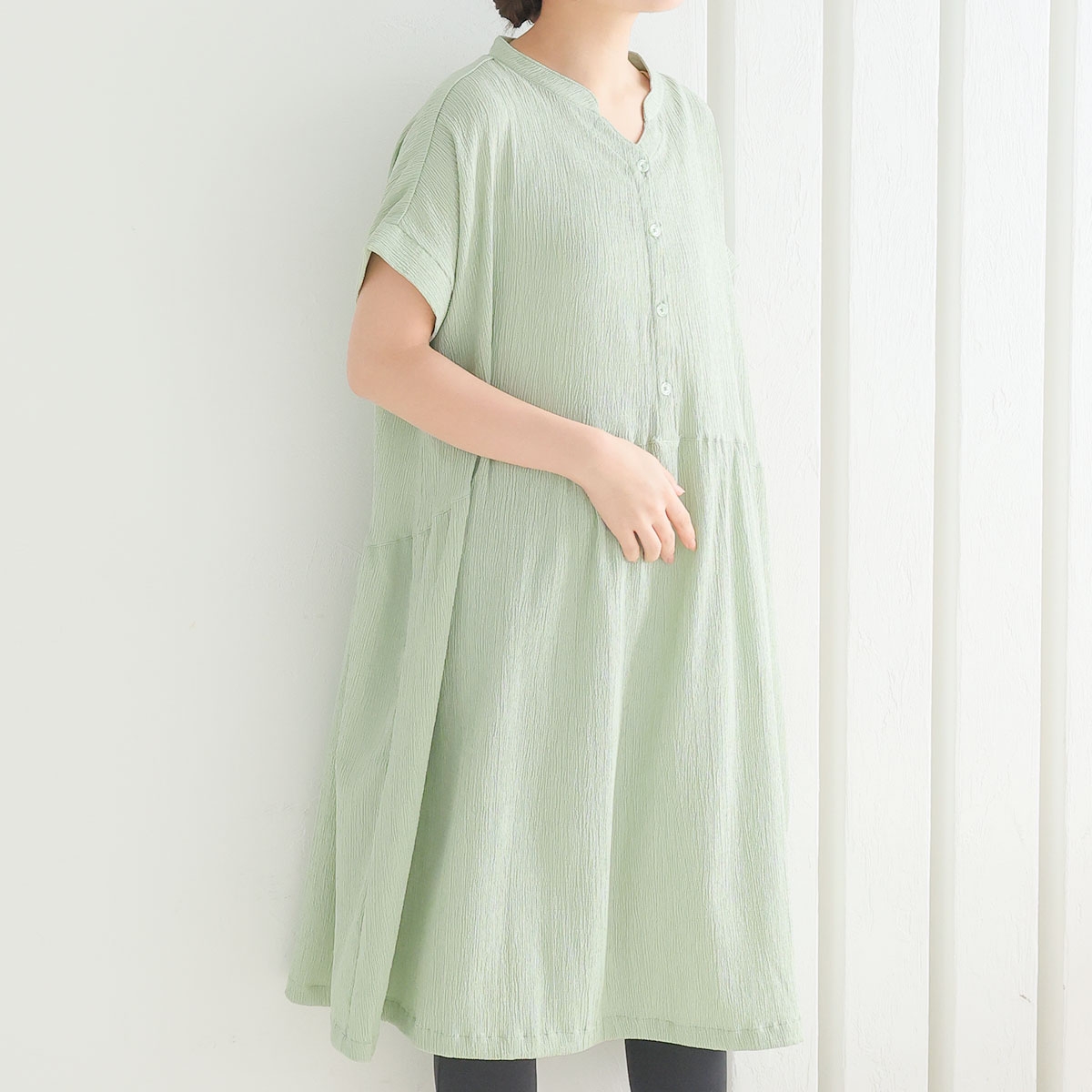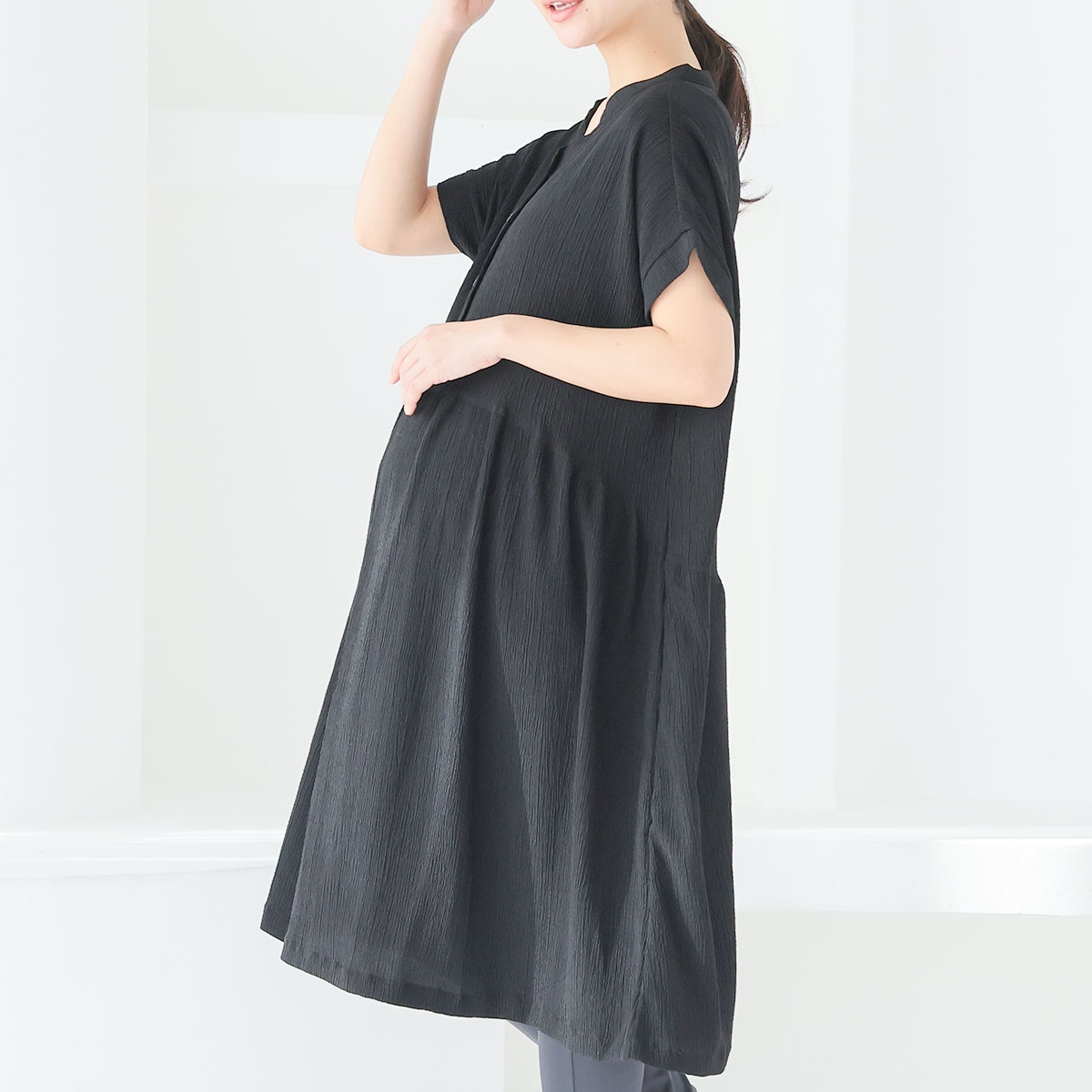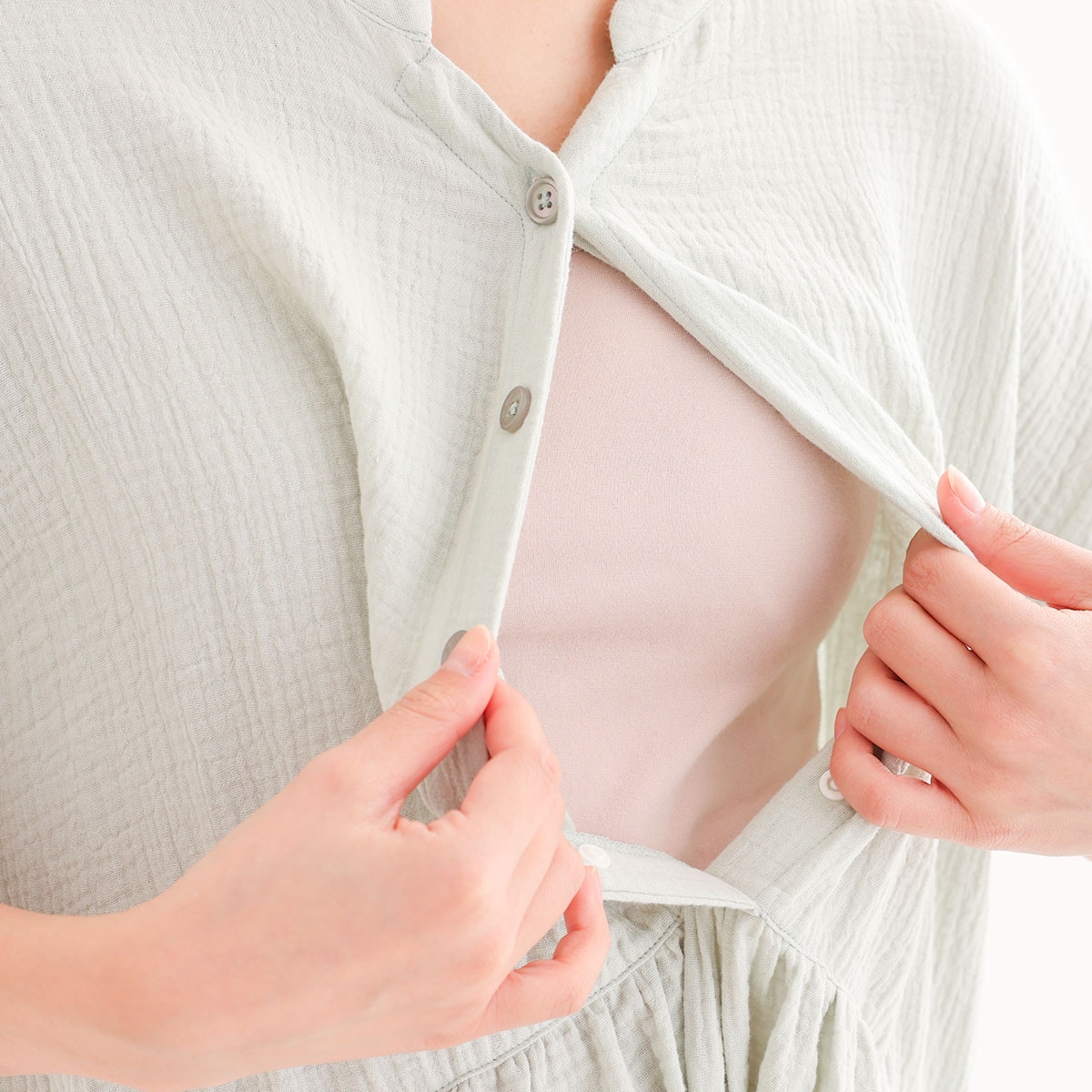胸元のボタンは飾りボタンで、実は片手でサッと開けられるスナップ仕様。とっさの授乳にとっても便利です!ゆったりとしたサイジングなので、マタニティ期の体型変化にも◎。産後はガーリーな雰囲気漂う女性らしいシルエットになるよう設計されています。
