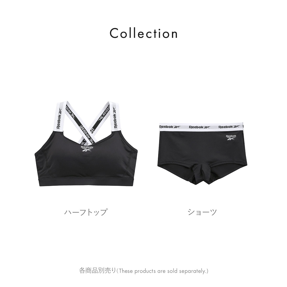 Reebokのアンダーウェアシリーズのハーフトップブラ。肩ゴムのロゴが織り込まれたロゴテープがポイント。