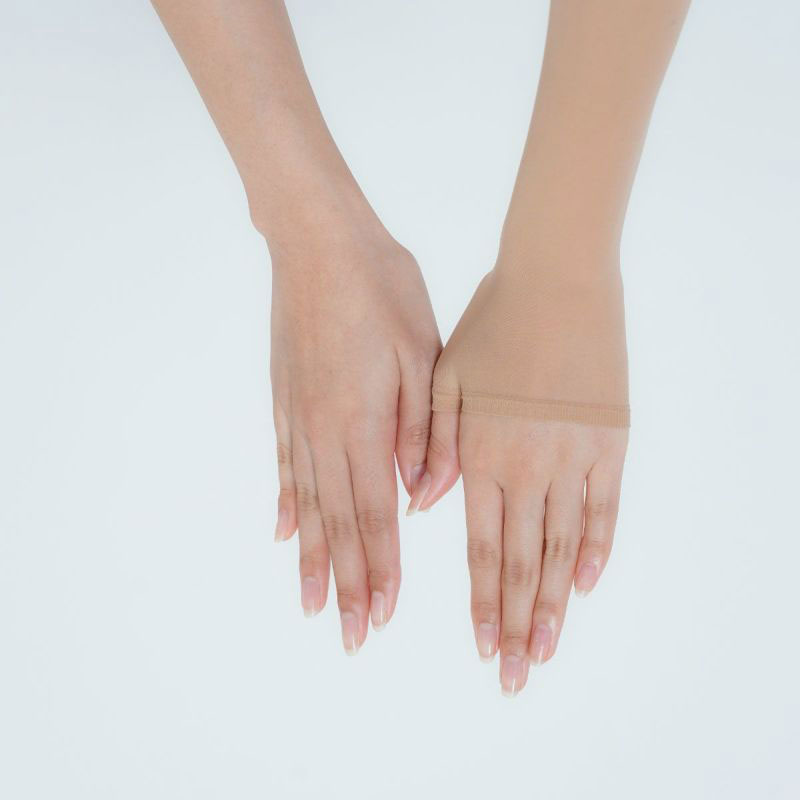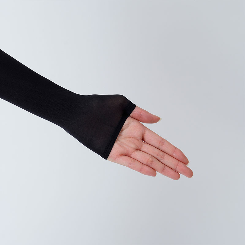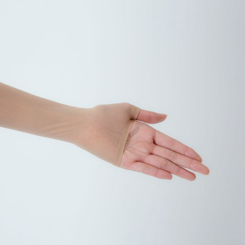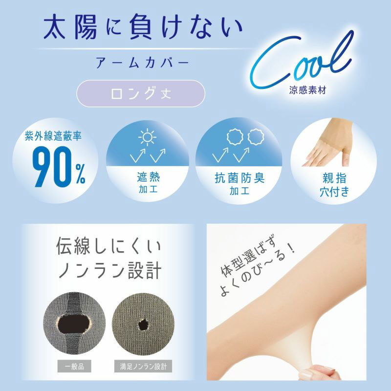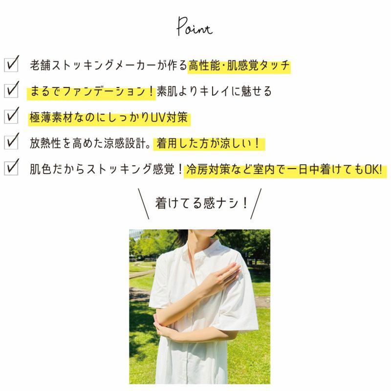 ストッキングの生地で作ったアームカバーです。肌なじみのよいベージュカラーで半袖から見える腕をきれいに見せてくれます。ストッキング生地の吸い付くようなフィット感はそのままに伝線しにくいノンラン設計でズレにくく快適。紫外線遮蔽率は90%!遮熱・涼感生地で涼しく、汗をかいても安心の抗菌防臭加工付き。親指穴付きでアームカバーをしたままスマホや作業もらくらく♪