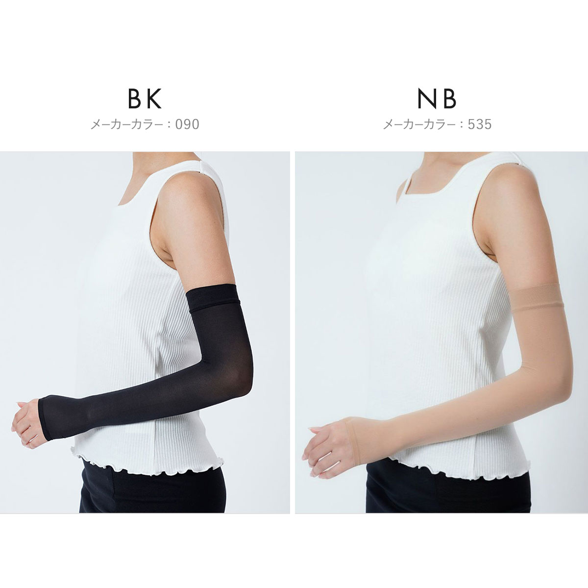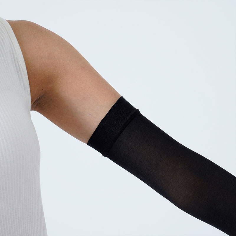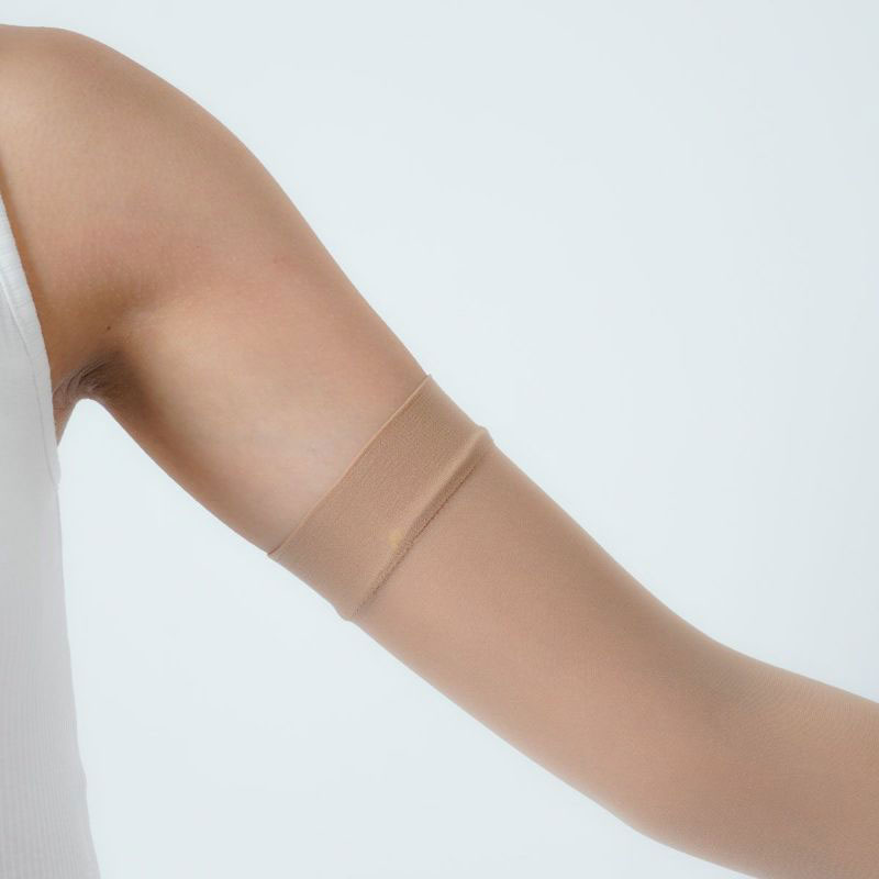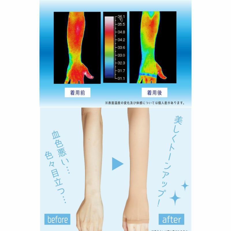 ストッキングの生地で作ったアームカバーです。肌なじみのよいベージュカラーで半袖から見える腕をきれいに見せてくれます。ストッキング生地の吸い付くようなフィット感はそのままに伝線しにくいノンラン設計でズレにくく快適。紫外線遮蔽率は90%!遮熱・涼感生地で涼しく、汗をかいても安心の抗菌防臭加工付き。親指穴付きでアームカバーをしたままスマホや作業もらくらく♪