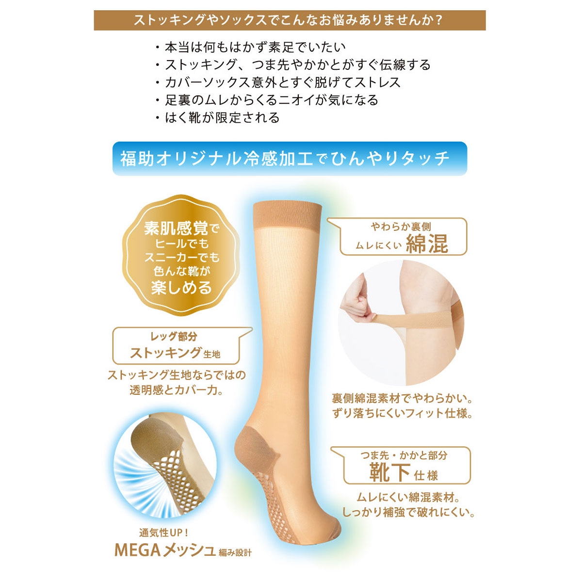 足裏の快適性と涼しさを追求した暑い季節にぴったりな高機能なアイテムです。最大の特長は、足裏が大きく穴の開いた福助独自設計の「メガメッシュ編み」になっていることです。通常の足底メッシュよりも大きく編み立てて通気性を大幅に向上させることで、汗などによる蒸れを軽減させます。さらに製品全体に「冷感加工」を施すことで暑い日でも涼しくお過ごしいただけます。それ以外にも履き心地にこだわり、つま先とかかと、口ゴムの内側を綿混素材にすることで、優れた吸湿性とさらっとした綿タッチの肌触りで快適に履いていただけます。足にしっかりフィットするように、靴下のようにかかと付のデザインを採用しているため、履いているうちに口ゴムがずれる等の不快感を軽減させています。丈は使いやすいハイソックス丈で、脹脛までしっかりカバーします。また、消臭加工が施されているため、気になるニオイを抑えるので、快適に着用いただけます。