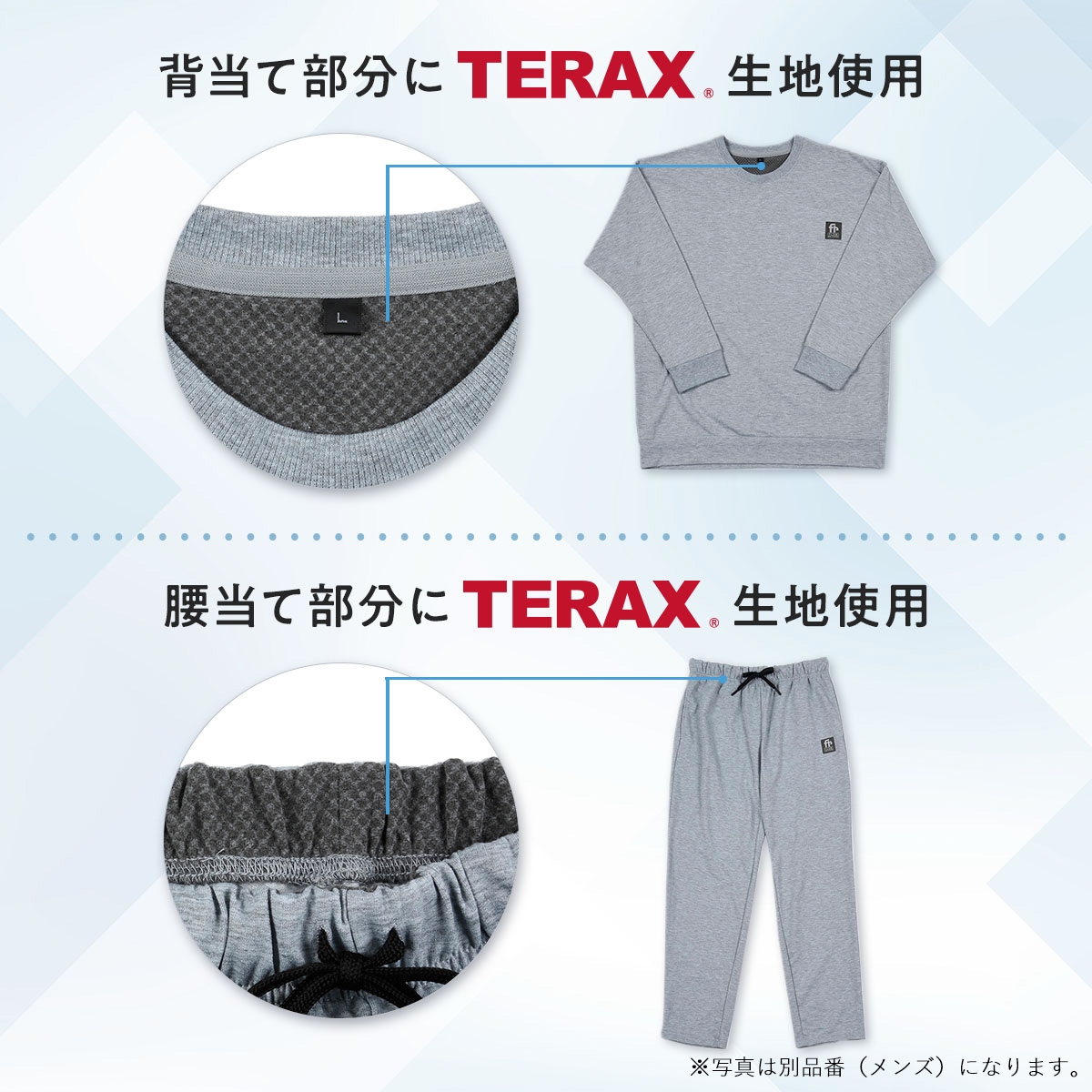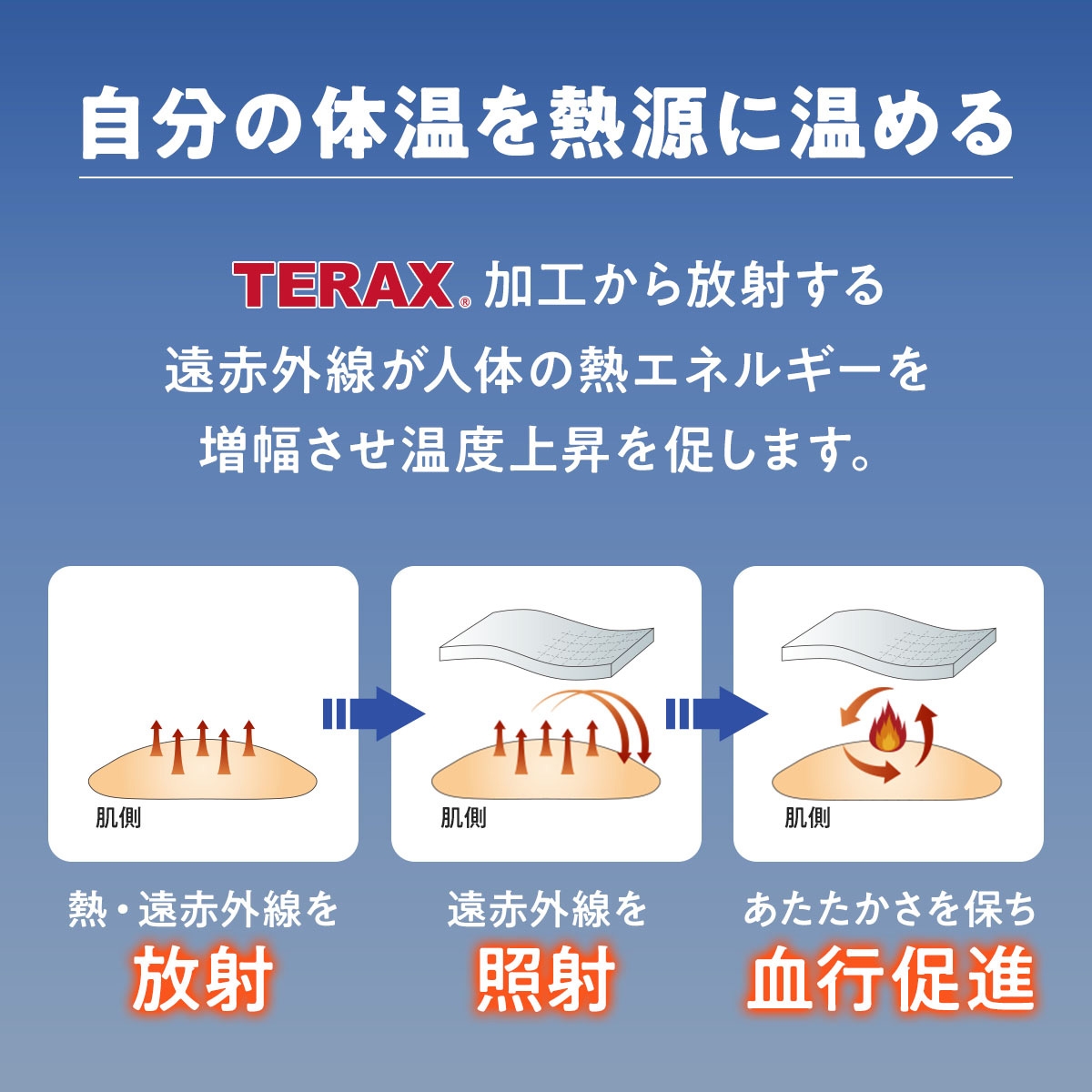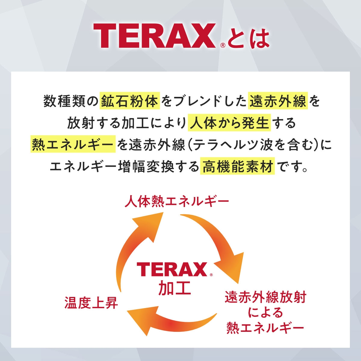 このブランドが大切にしているのは、特別な準備を必要としない、日常の中での質の高い休息です。その要となるのが、最先端の技術を駆使した高機能素材「TERAX」の採用です。背中や腰といった、一日の終わりに重さを感じやすい部位の裏側には、数種類の天然鉱石をブレンドした生地を使用しております。この素材が身体から放たれるエネルギーを遠赤外線として効率よく活用することで、血行が促進されます。