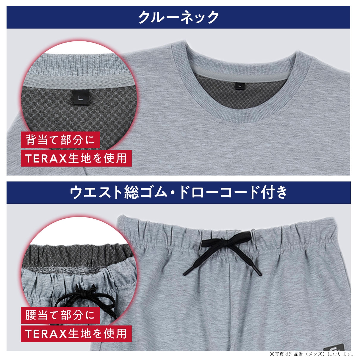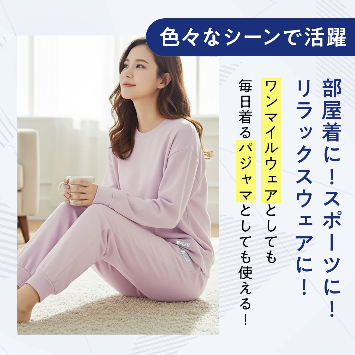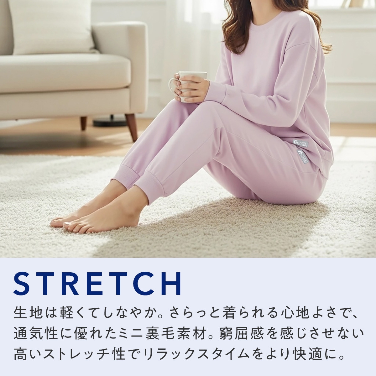お肌に直接触れる素材には、空気を編み込んだような柔らかな質感のミニ裏毛を採用し、身体を締め付けから解放するゆったりとしたシルエットを追求しました。眠っている間も、リビングでくつろぐ時間も、身体に余計なストレスを感じさせない究極の着心地を実現しています。