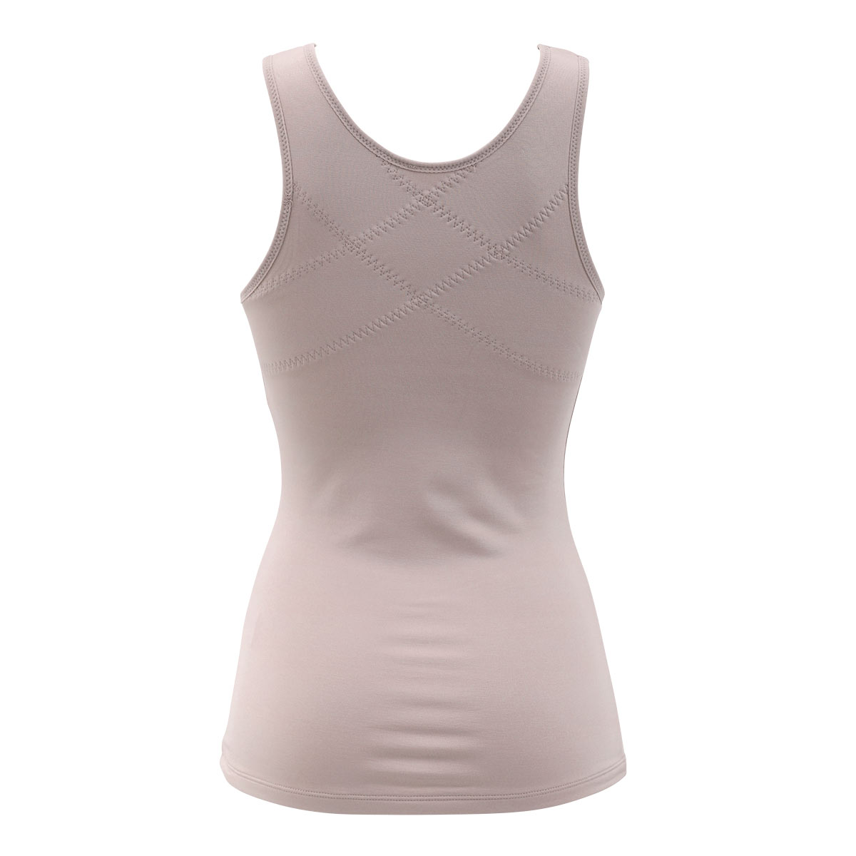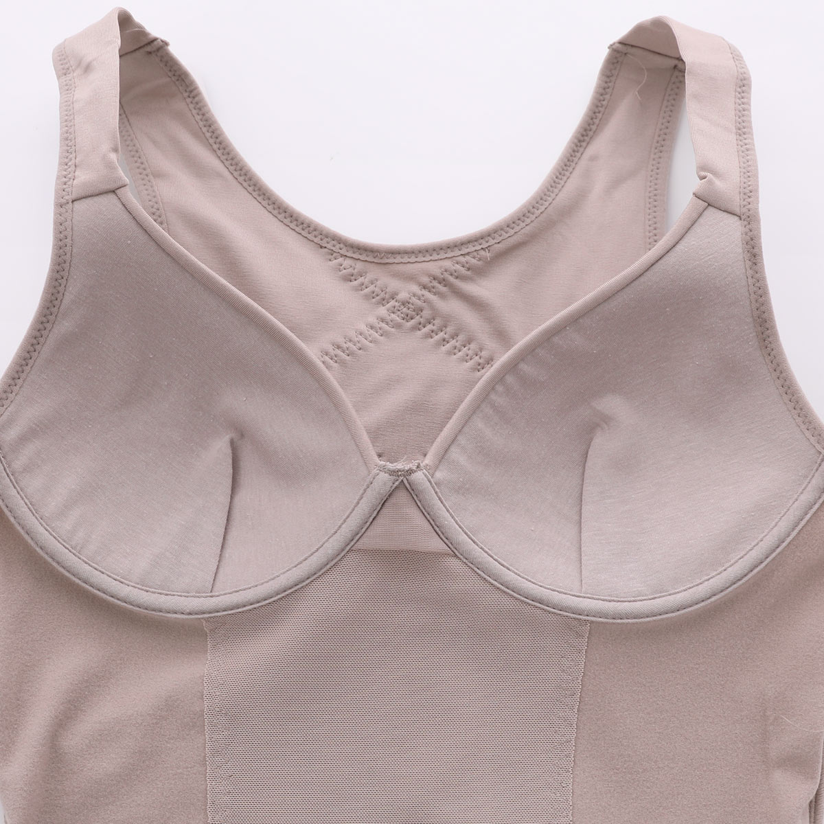 フロント部分のパワーネット構造により、おなかをしっかり押さえます。背中部分はバッククロスパワーネット構造ですっきり姿勢をサポート。カップ部分は内蔵モールドカップでしっかりとバストを支えます。