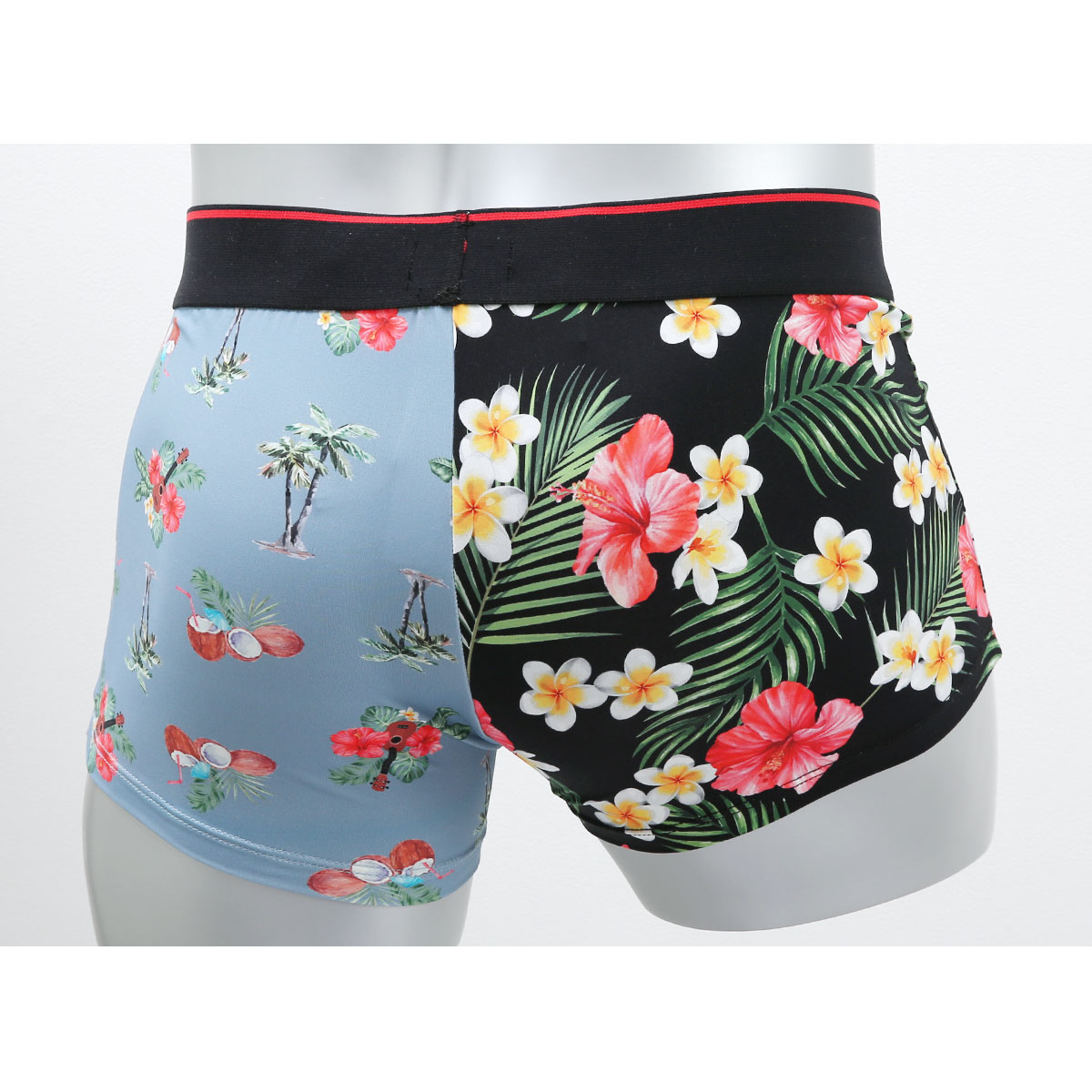 2種類のフラワープリントをつなぎ合わせた、斬新なデザインのボクサーパンツ。身生地はしなやかでストレッチ性のあるマイクロファイバーを使用。程よく身体にフィットします。ウエストバンドにはビンテージジャカードロゴをのせ、ブランディングを強調します。