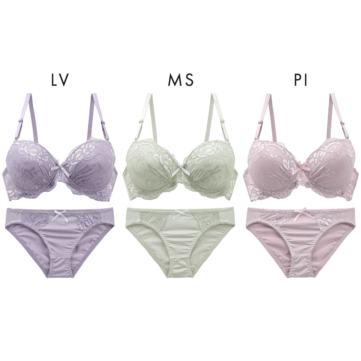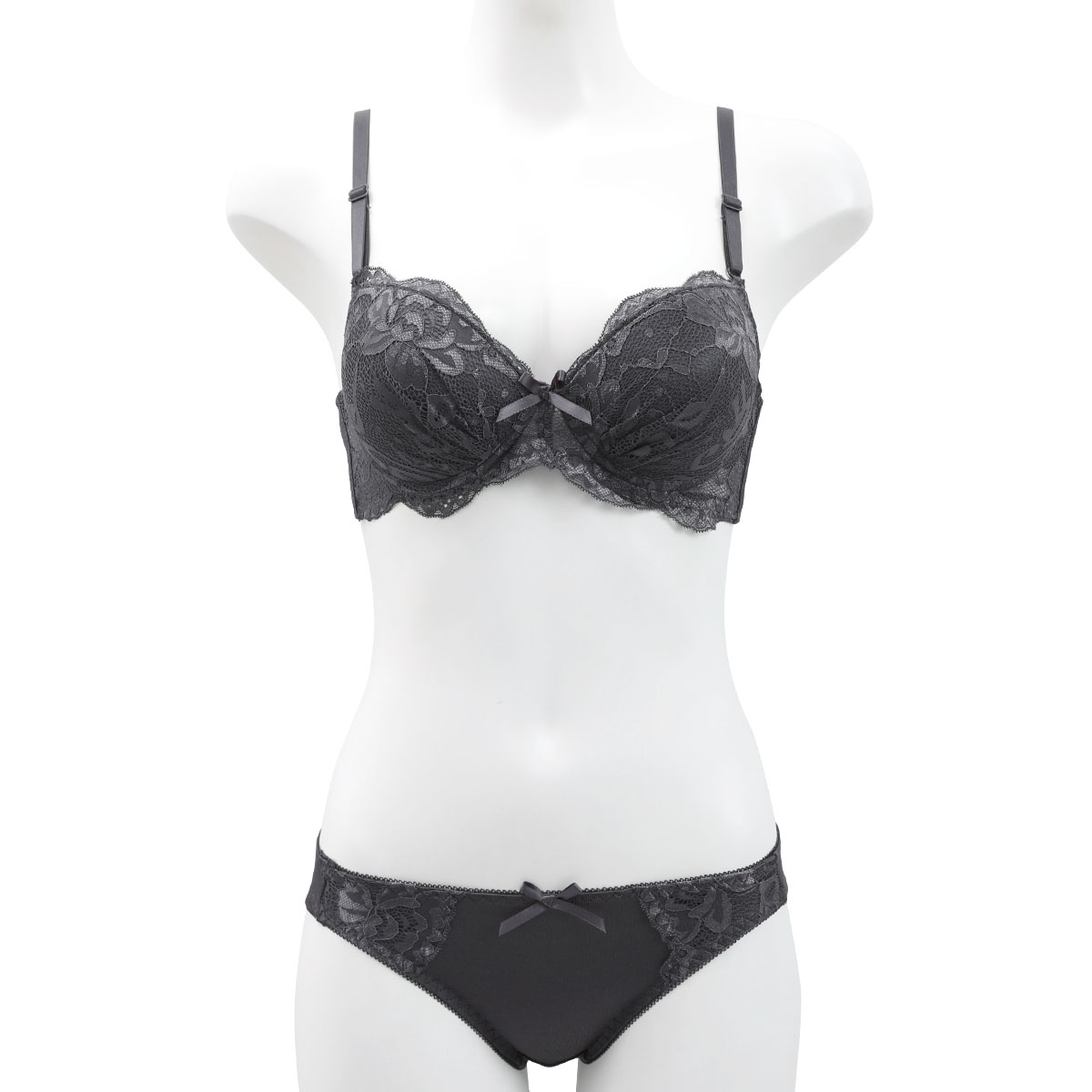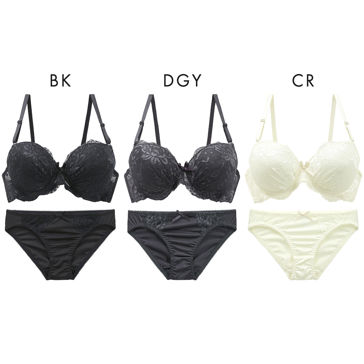 同色系のレースがゴージャスなブラ&ショーツセットです。内臓された超肉厚パッドが寄せて上げて、美胸をメイクします。