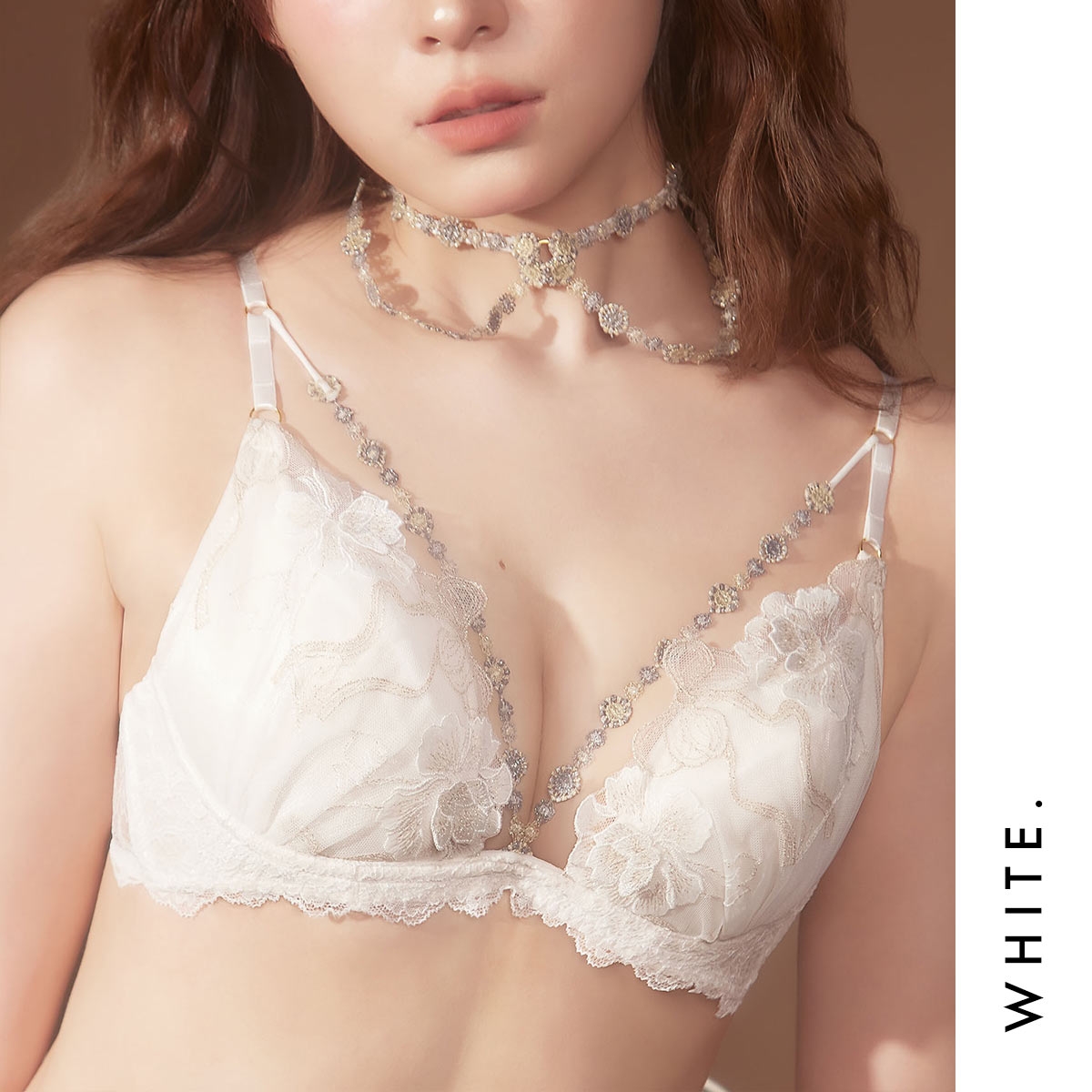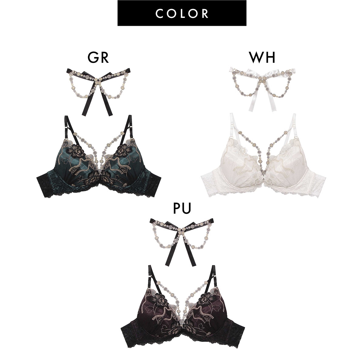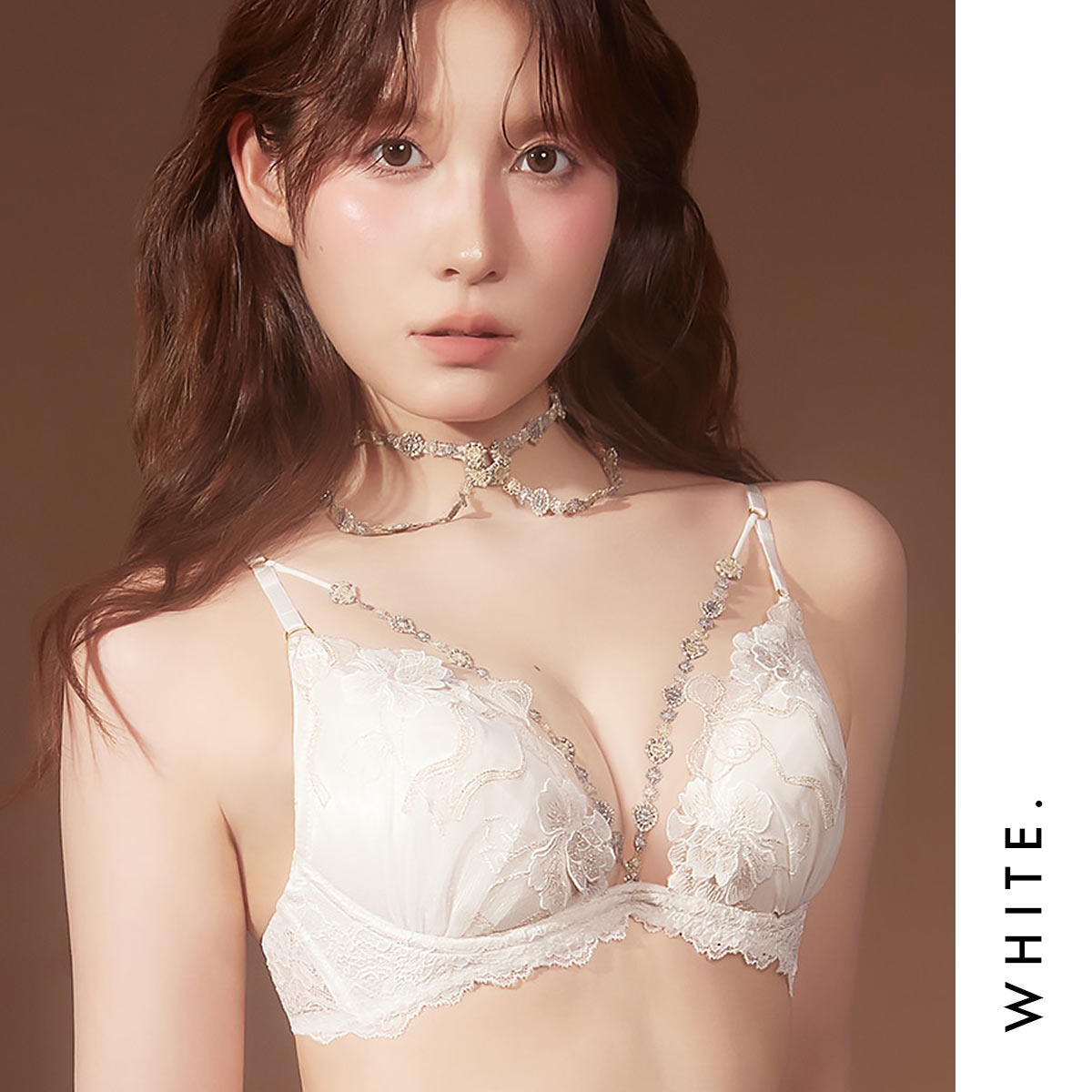 カップパターンは、浅めのカップでセクシーに谷間を魅せながら脇流れも防ぐ【トリックリフト】。中心を広く開けたフロント設計は、Vネックやデコルテを大胆に魅せるドレスアップを、より美しく完成させます。