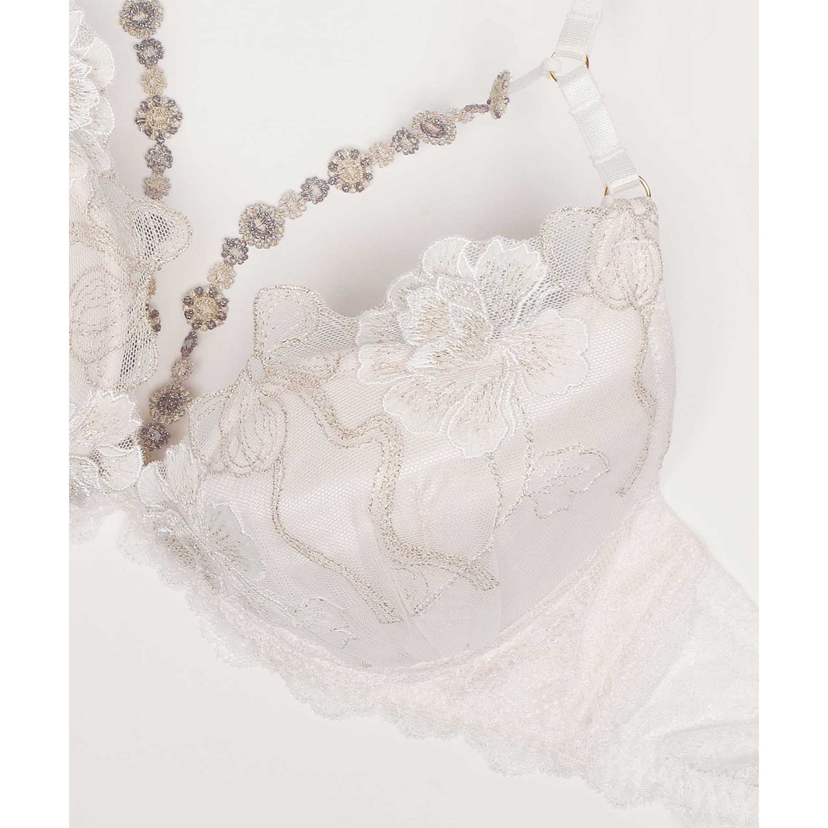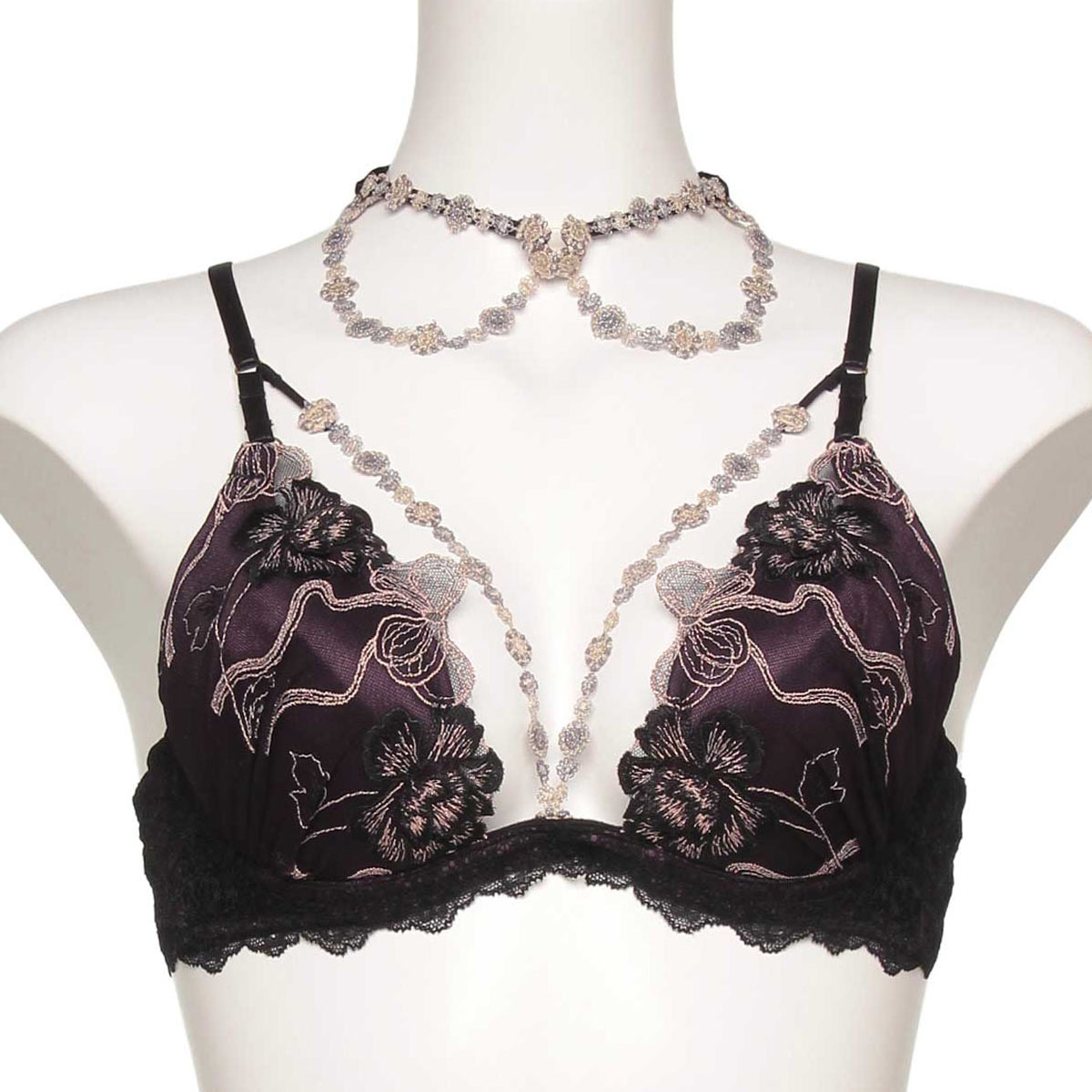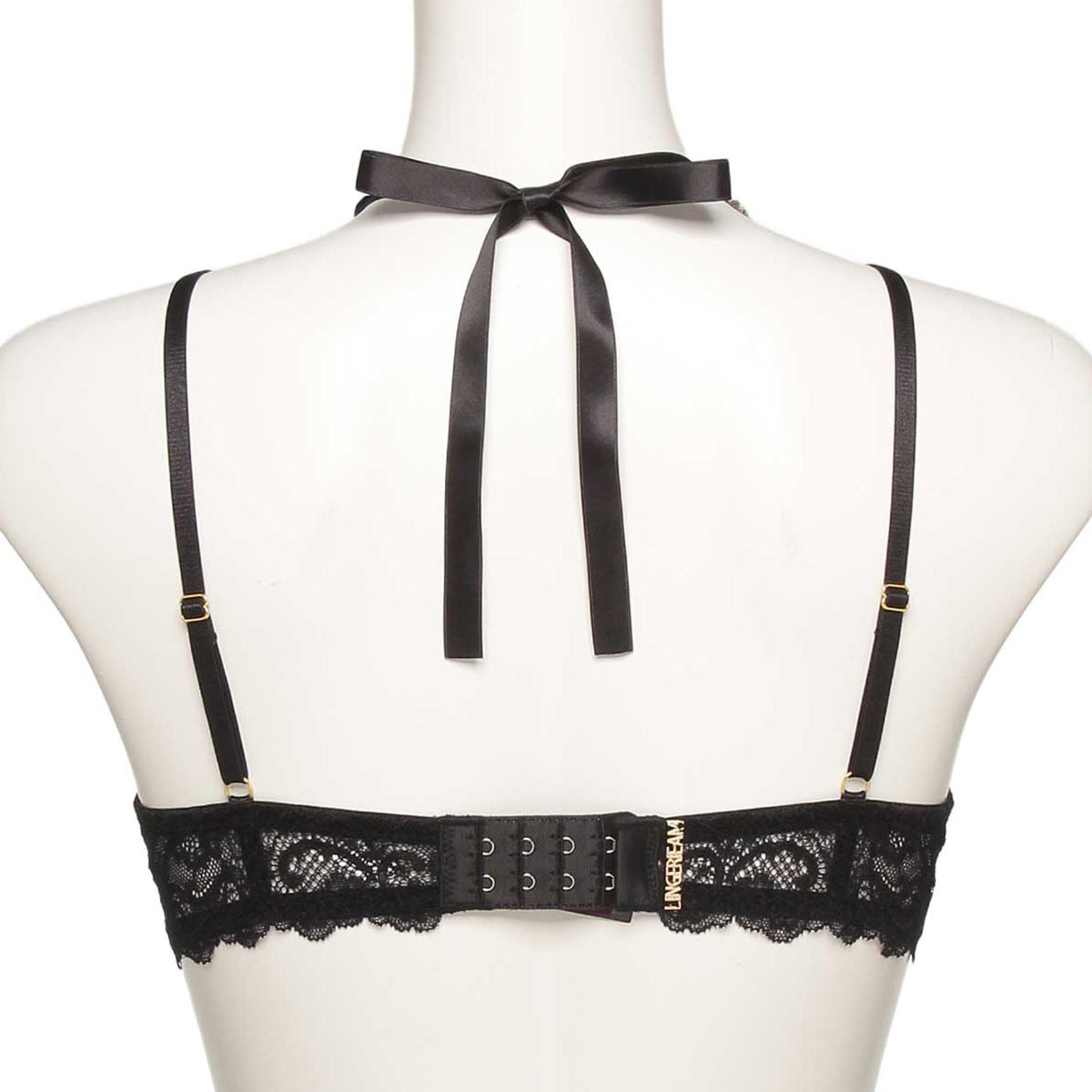 ゴールドとシルバーのラメ糸のみで仕立てたチョーカー付きブラジャー。バックできゅっと結ぶサテンリボンがキュートなポイント。