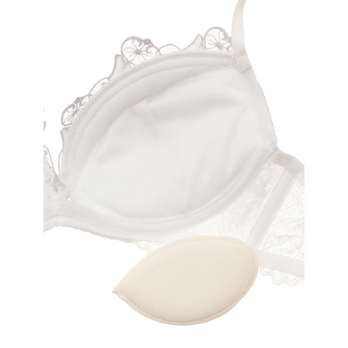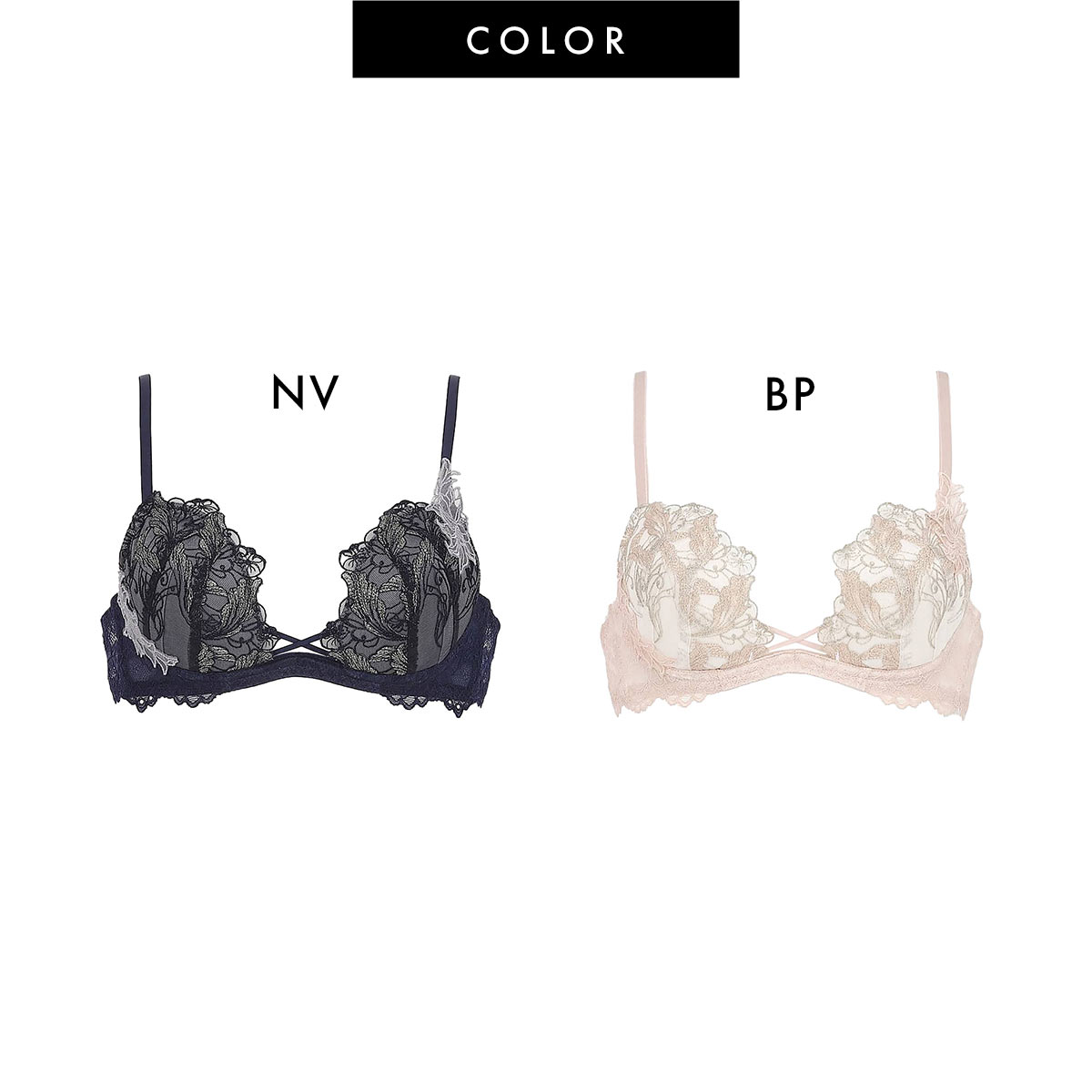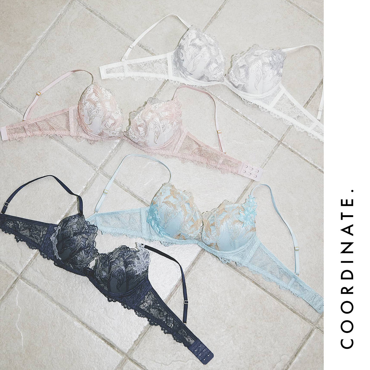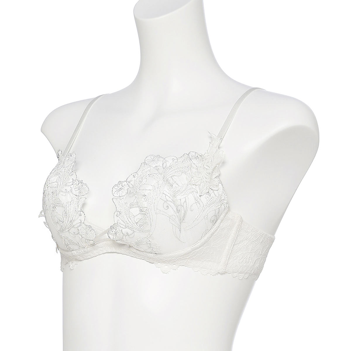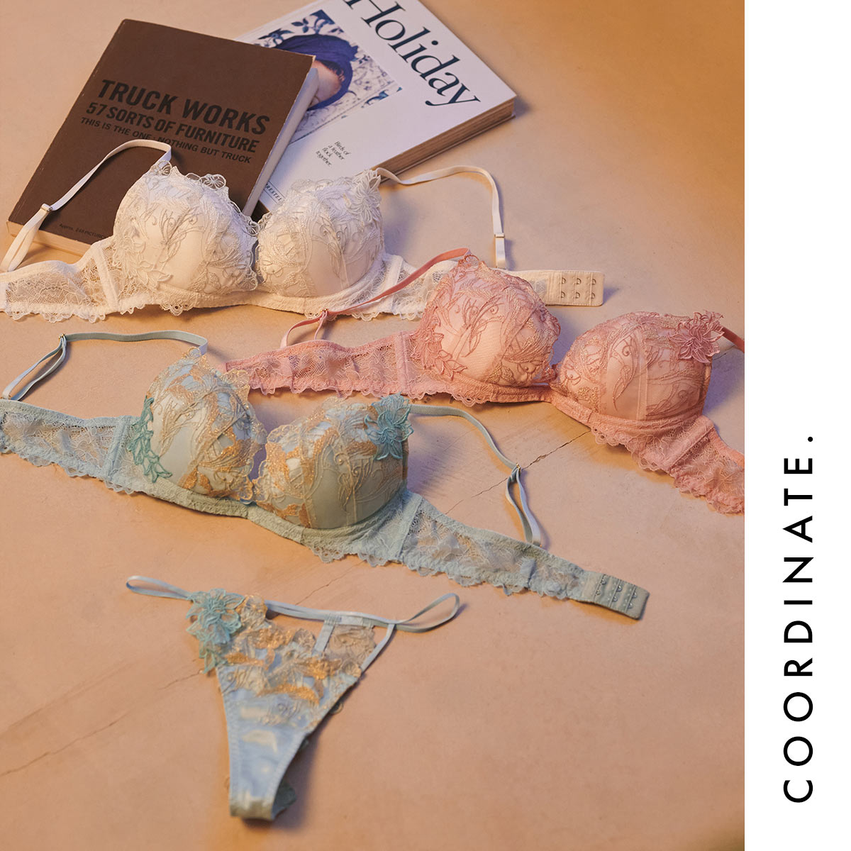 水面にキラキラと漂うマーメイドの尾ひれをイメージしたレースデザイン。カップ全体にラメ糸が輝き、カップサイドとアンダーのレースで、軽やかな透け感をプラス。胸中心にはクロスのコードを渡らせ、しっかりとバストを寄せて支えます。