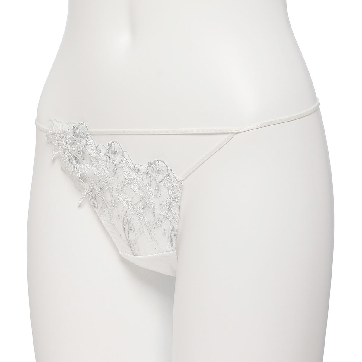 水面にキラキラと漂うマーメイドの尾ひれをイメージしたレースデザイン。フロントはお肌をセクシーに魅せるアシンメトリーデザインです。フロント右側にはブラとお揃いのモチーフを配してゴージャスに。