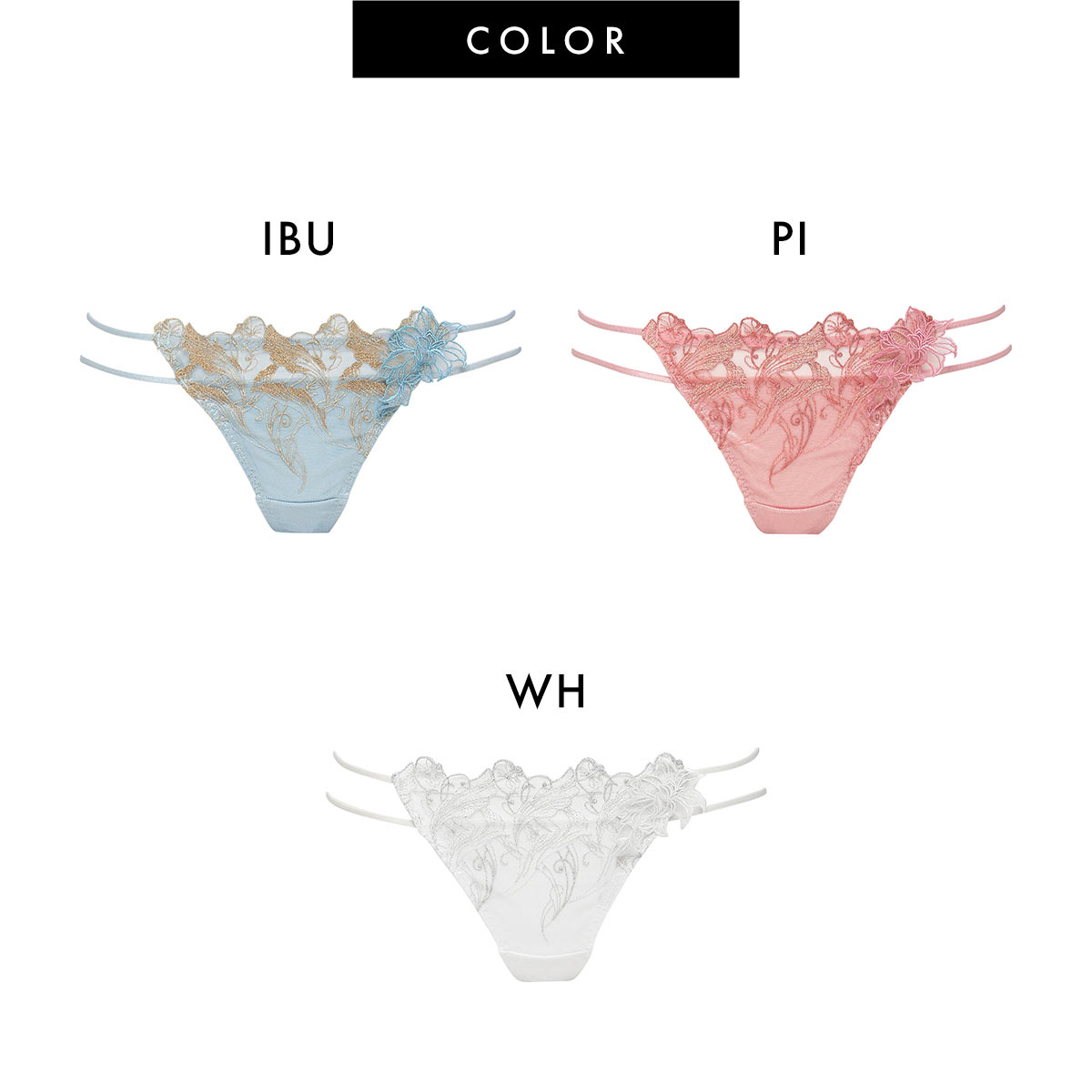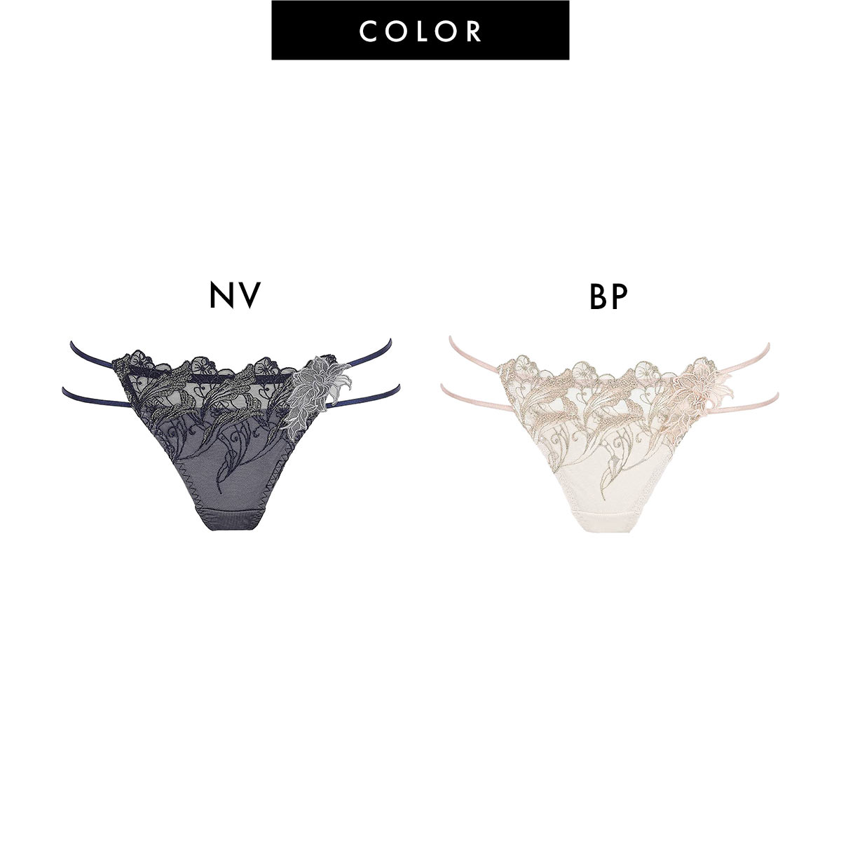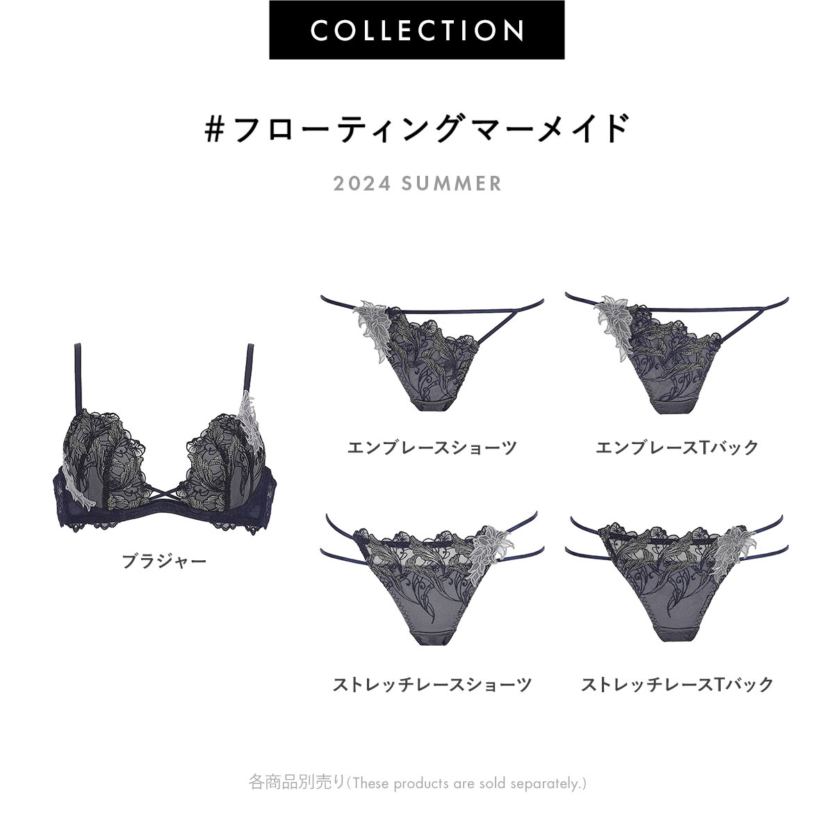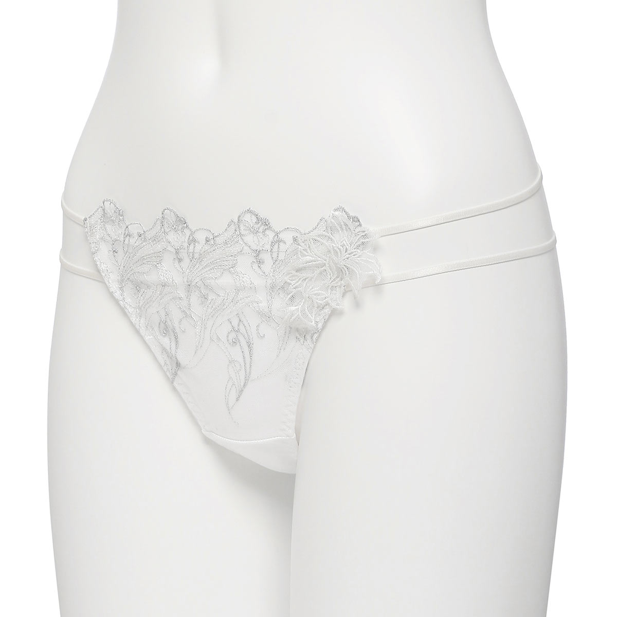 水面にキラキラと漂うマーメイドの尾ひれをイメージしたレースデザイン。フロントは裏打ちとレースをずらし、お肌の透け感を残して軽やかな印象に仕上げています。フロント左側にはブラとお揃いのモチーフを配してゴージャスに。