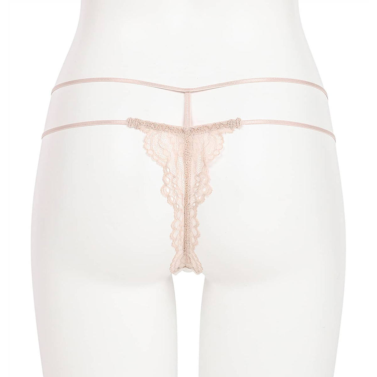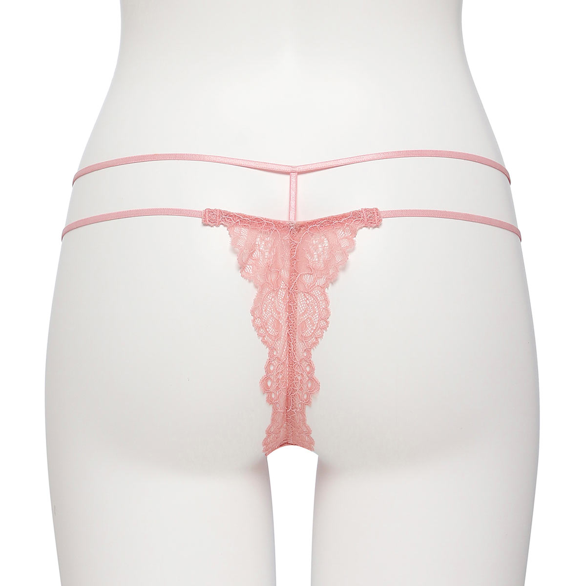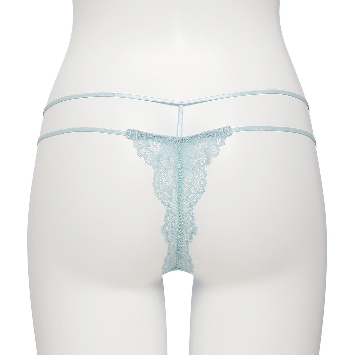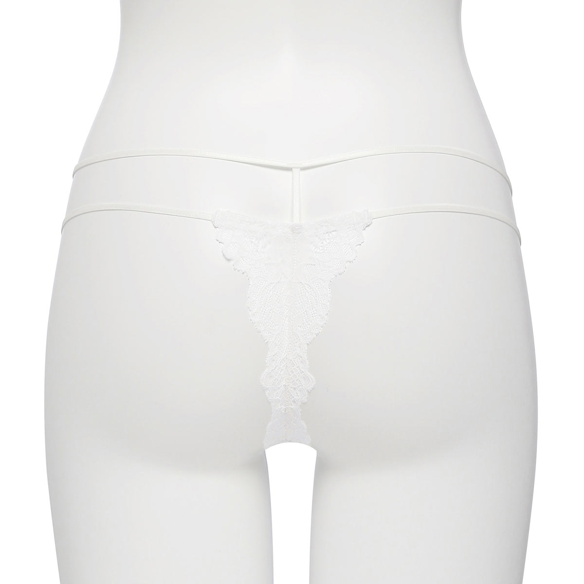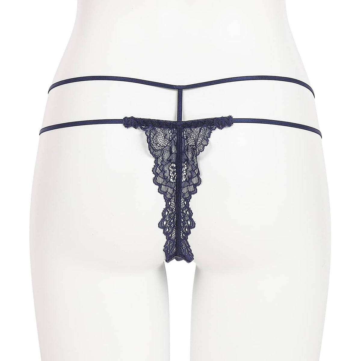 バックはヒップに心地よくフィットする薄くやわらかなストレッチレースを使用。指を絡めたくなるセンシュアルなコードは、ウエストラインに目を惹くアクセントに。ノーマルショーツとTバックショーツで、コードデザインを変え、違う印象に仕上げています。