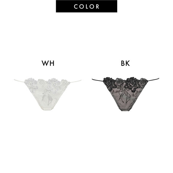 シンプルで穿きやすいストリングショーツですが大ぶりなスカラップが美しく印象的。ストレッチレースをV字にカットしたバックは穿きやすさと色っぽさを叶えるデザインです。