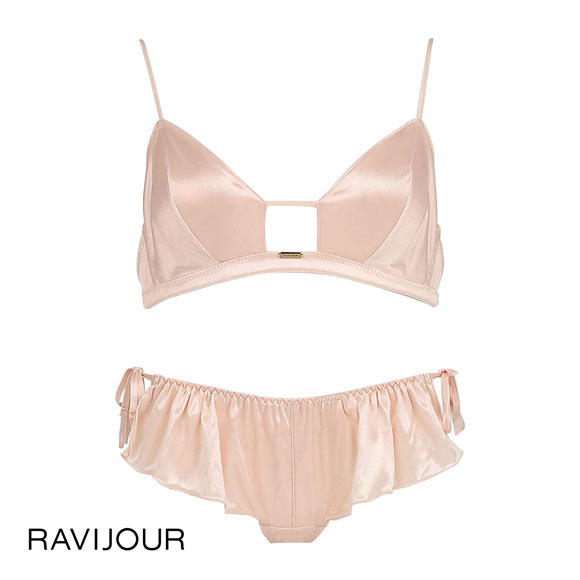 ブラは光沢があり、柔らかなスムース素材を全面に使用し、すっきりとして上品な印象。前中心にはコードと、RAVIJOURのロゴプレートでアクセントをつけています。ストラップは華奢印象の細めのタイプを採用。