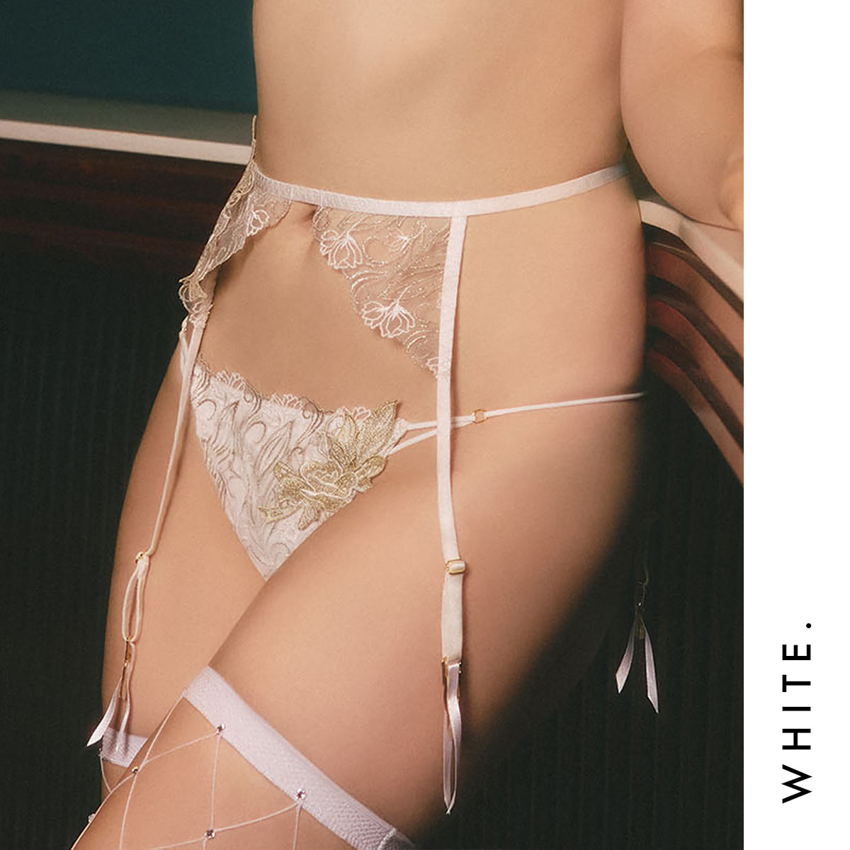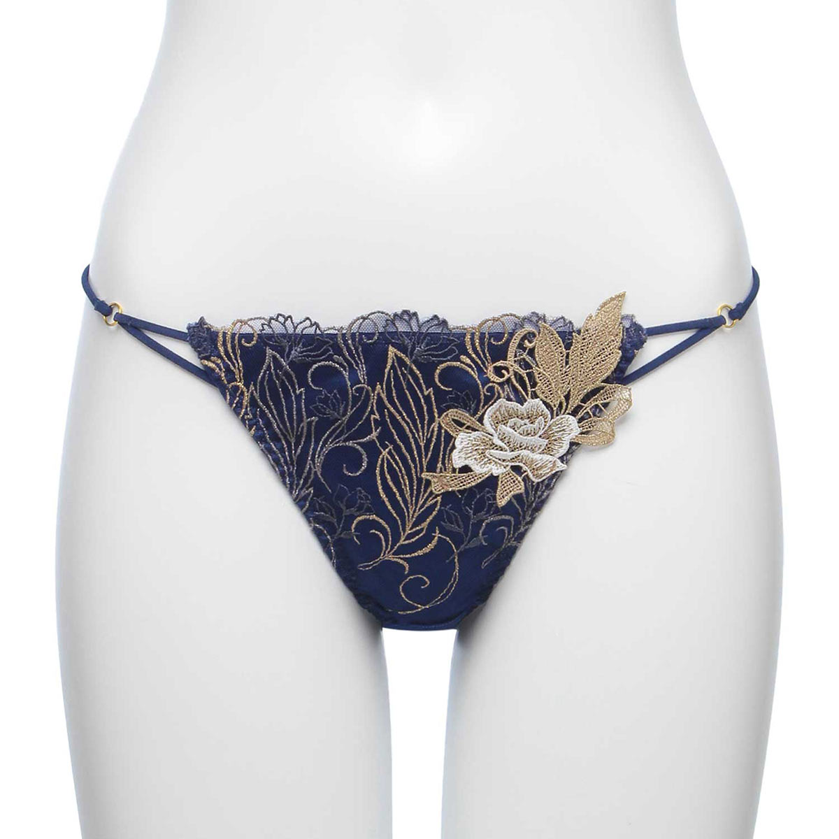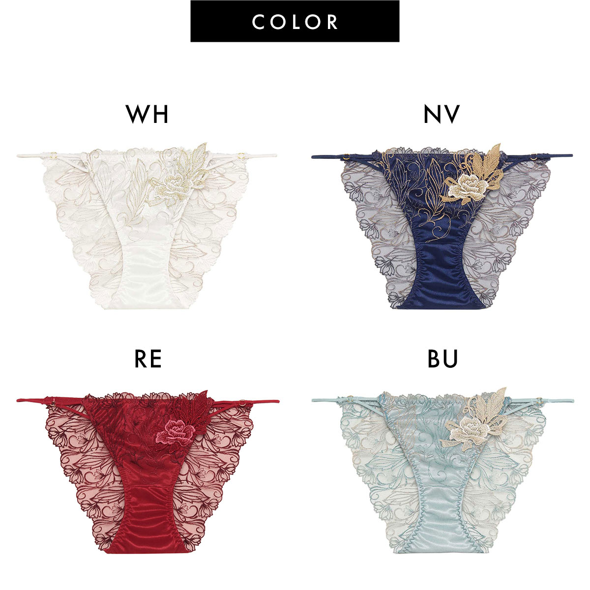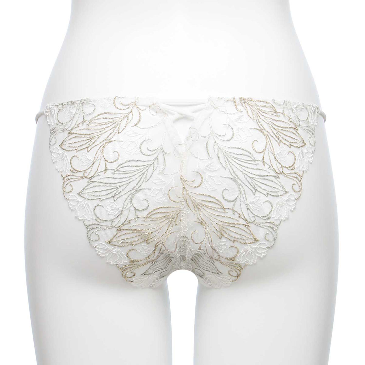羽と波のような曲線を描く華やかなエンブロイダリーレースが印象的なノーマルショーツです。サイドのストリングコードデザインが、腰回りをセンシュアルに演出。バックもエンブロイダリーレースを贅沢に使用したグラマラスなショーツです。