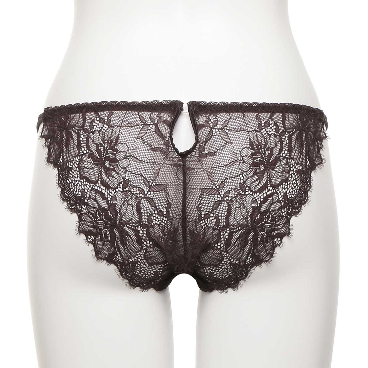 繊細なレースがベルベットの深みを引き立てるノーマルショーツ。サイドの2本のストリングコードが視線を誘うアクセントに。バックの涙型ホールがセンシュアルなバックスタイルを演出します。